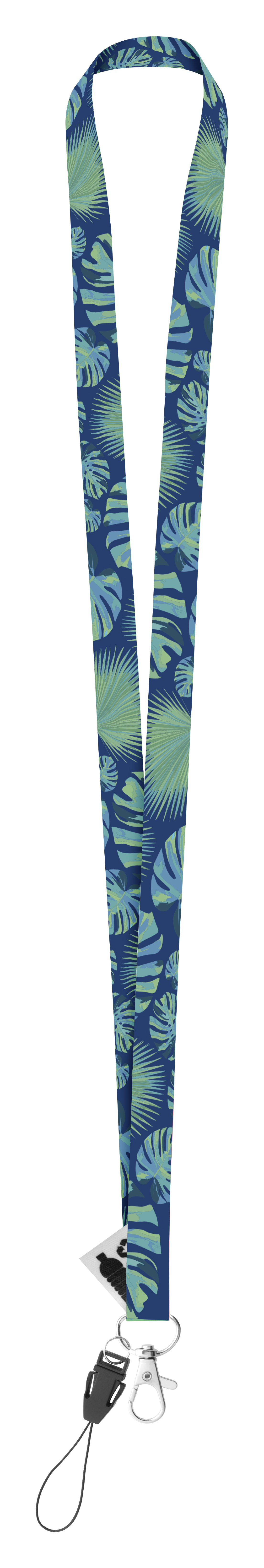 RPET lanyard 15 mm na zakázku s kovovou karabinkou a šňůrkou na mobil. Cena zahrnuje sublimační potisk na obou stranách, nezahrnuje tiskovou přípravu. Min. mn.: 100 ks.