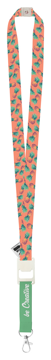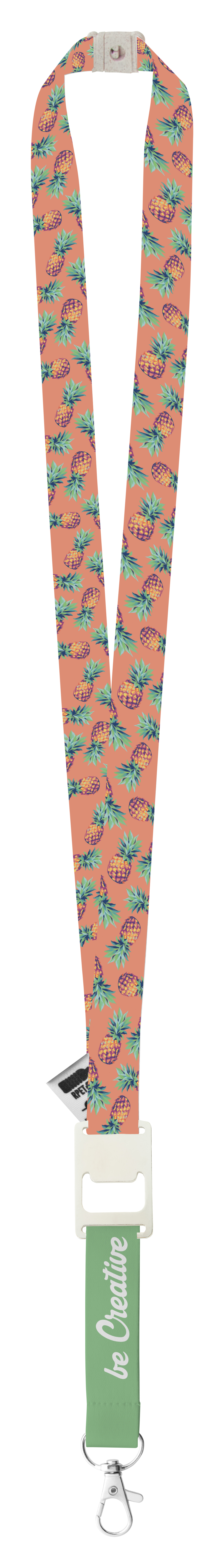 Polyesterový lanyard RPET na zakázku s kovovou karabinkou a otvírákem na láhve a bezpečnostní přezkou z plastu z pšeničné slámy. Cena zahrnuje sublimační potisk na obou stranách, nezahrnuje tiskovou přípravu. Min. mn.: 100 ks.