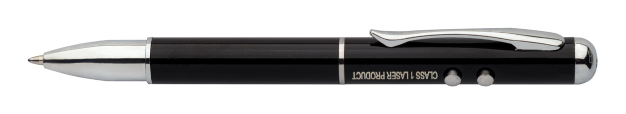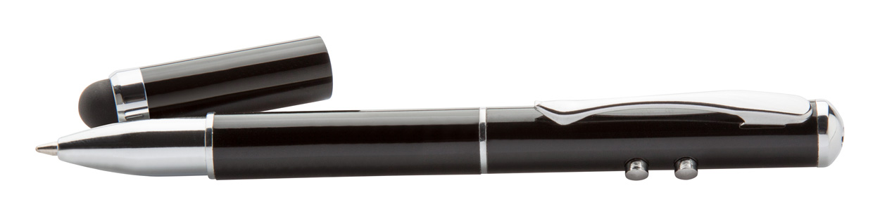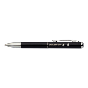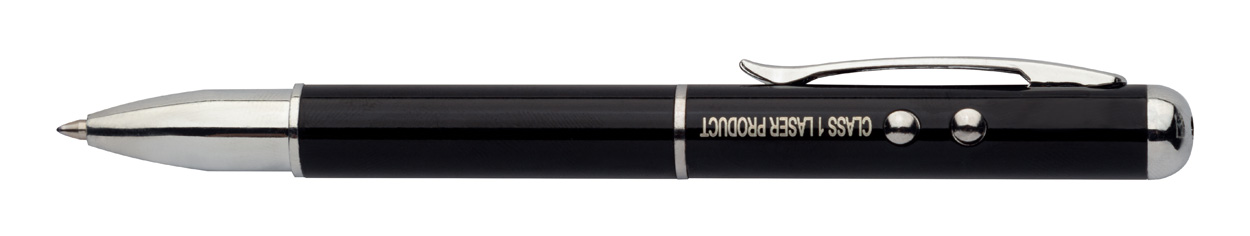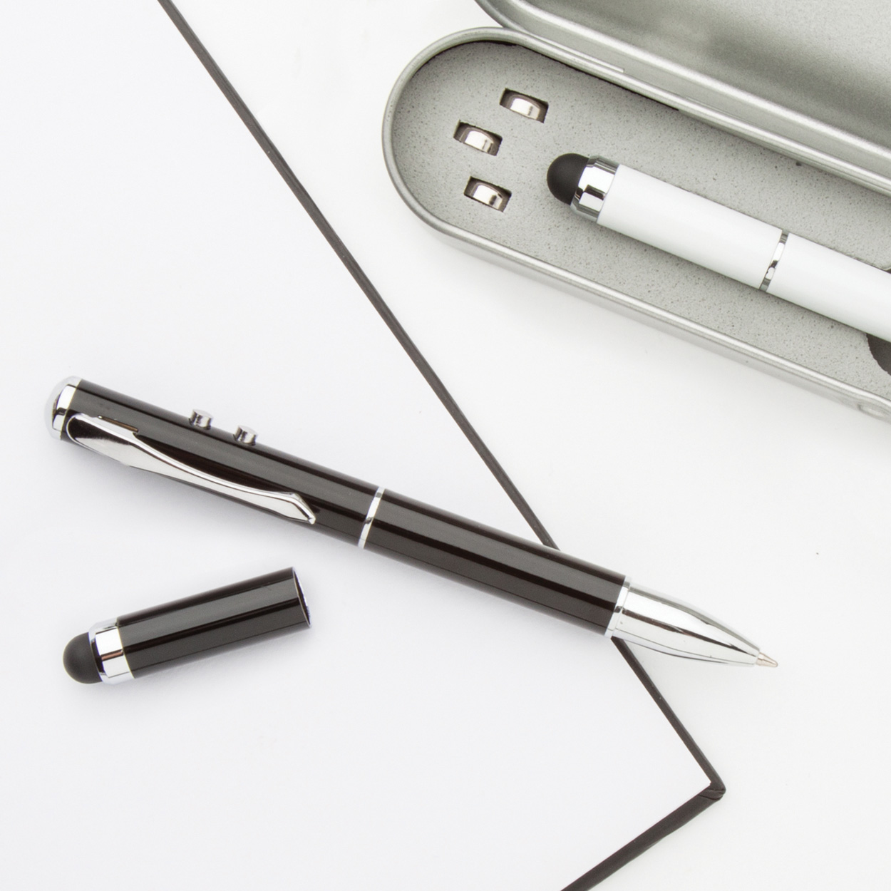 Multifunkční laserové ukazovátko s perem pro dotykové displeje a LED světlem. V kovové krabičce. Dodáváno včetně baterií a s modrou náplní.