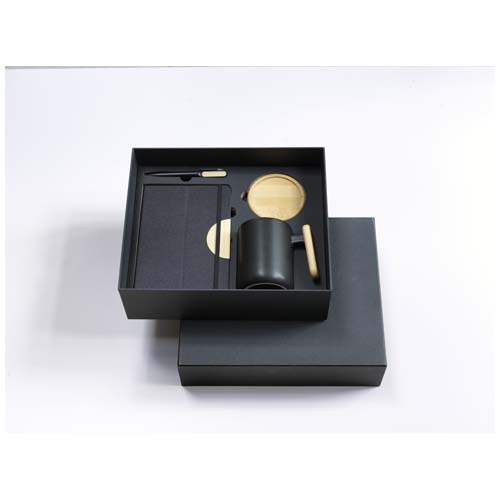 Dárková sada Laura obsahuje zápisník A5 z materiálu RPET s tvrdou vazbou, kuličkové pero, keramický hrnek a podtácek. Zápisník má černý elastický uzávěr, stuhu jako záložku a 80 linkovaných listů papíru v krémové barvě o gramáži 80 g/m². Desky zápisníku spolu s bambusovým půlkruhem fungují jako stojánek na telefon. Kuličkové pero je vyrobeno z recyklovaného hliníku s certifikací RCS s černým nástřikem a bambusovými doplňky na obou stranách horní části těla pera. Inkoust do pera: Černá. Délka psaní: 400 metrů. Keramický hrnek o objemu 480 ml je dodáván s bambusovým podtáckem. Pouze ruční mytí. Velikost hrnku: 11 × 12,7 cm. Průměr podtácku: 9,5 cm. Velikost dárkové krabičky: 32 × 27 × 10,3 cm.