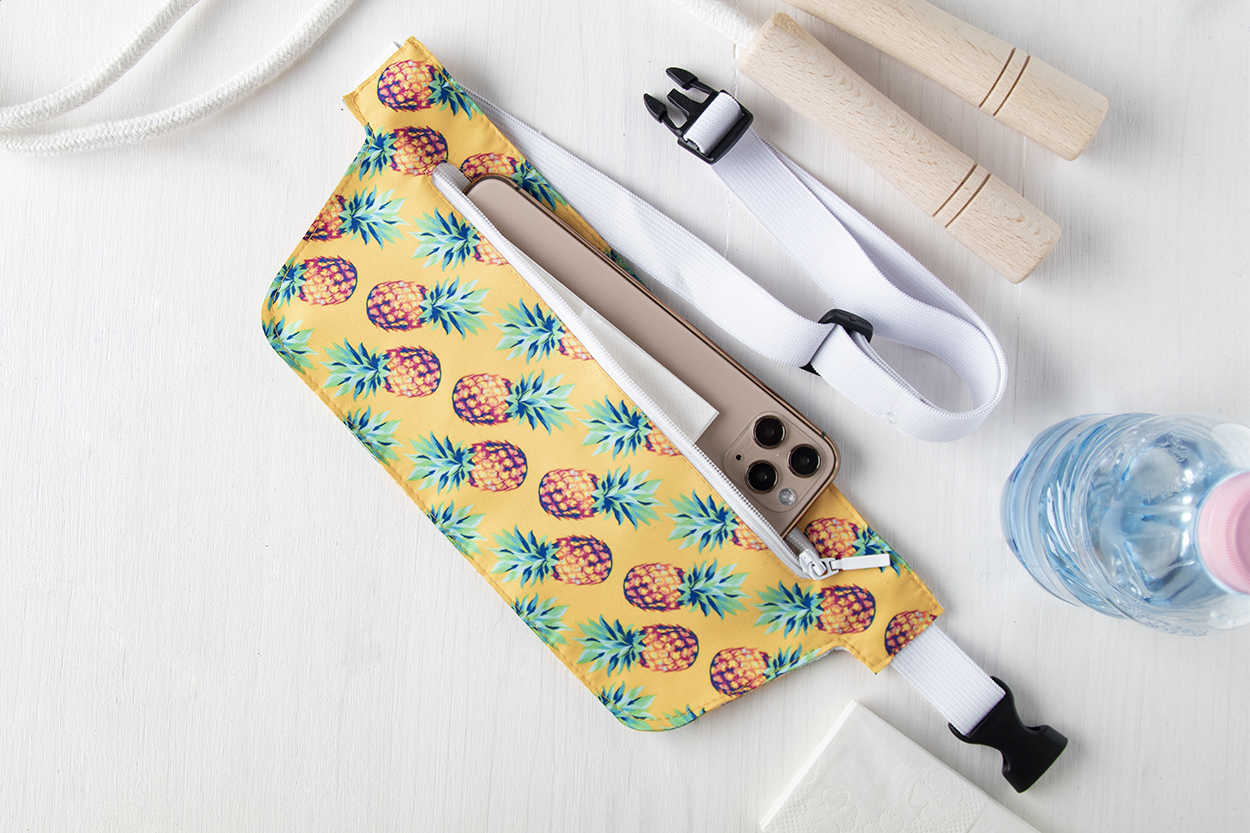 Na zakázku vyrobená ledvinka z polyesteru. S přihrádkou na zip a nastavitelným elastickým pasem. Cena zahrnuje celoplošný sublimační tisk, nezahrnuje tiskovou přípravu. Min. mn.: 50 ks.