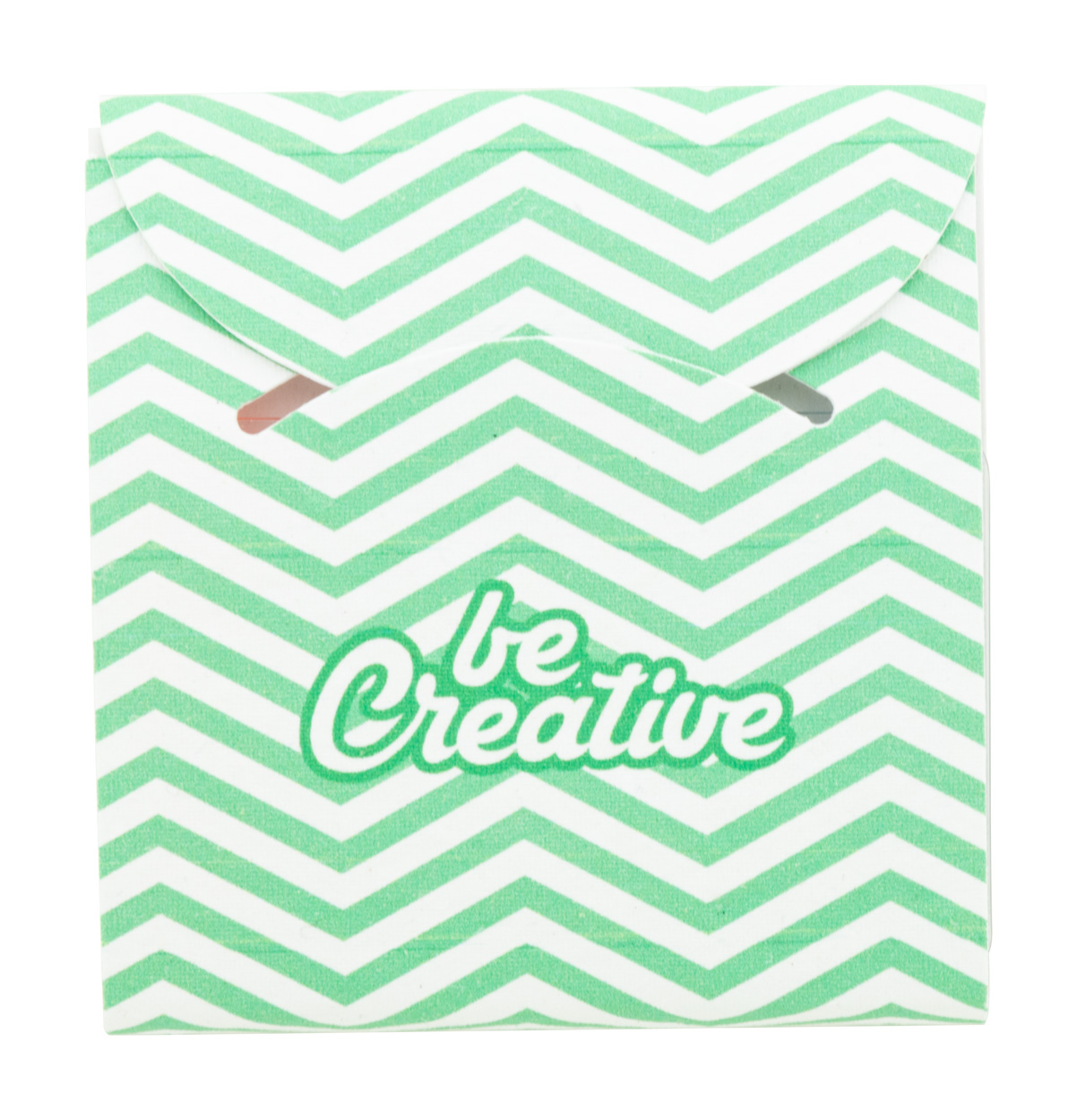 Na zakázku vyrobený lepicí poznámkový blok pokrytý semenným papírem s různými semeny divokých květin. Obsahuje 50 listů samolepicích papírů z recyklovaného papíru (75×75 mm) a 100 plastových fóliových značkovačů stránek v 5 různých barvách (44×12 mm). Cena zahrnuje celobarevně potištěný vnější obal, nezahrnuje tiskovou přípravu. Min. mn.: 100 ks.