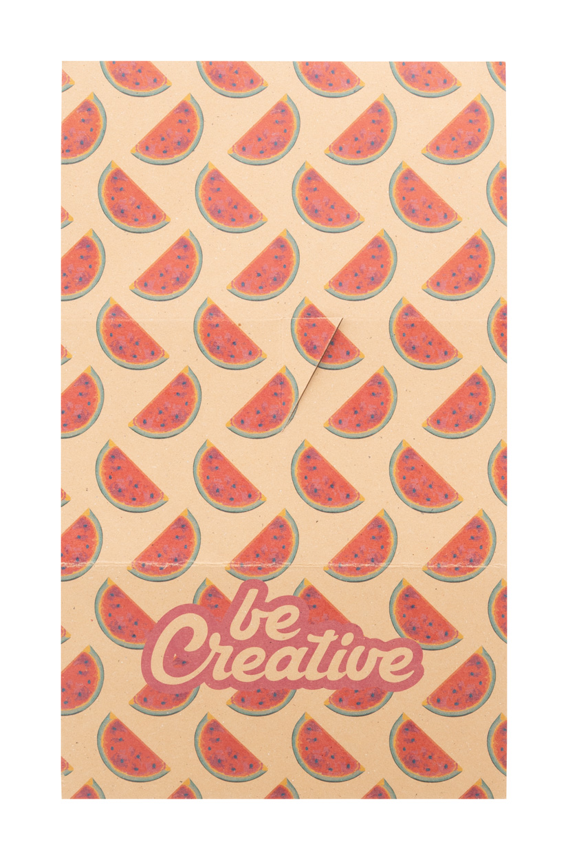 Na zakázku vyrobený držák na papírové bankovky z kraftového papíru s vertikální hlavičkou. Obsahuje 50 samolepicích papírk z recyklovaného papíru (75×75 mm) a 100 plastových fóliových značkovačů stránek v 5 různých barvách (44×12 mm). Cena včetně plnobarevného potisku hlavičky, nezahrnuje tiskovou přípravu. Min. mn.: 100 ks.