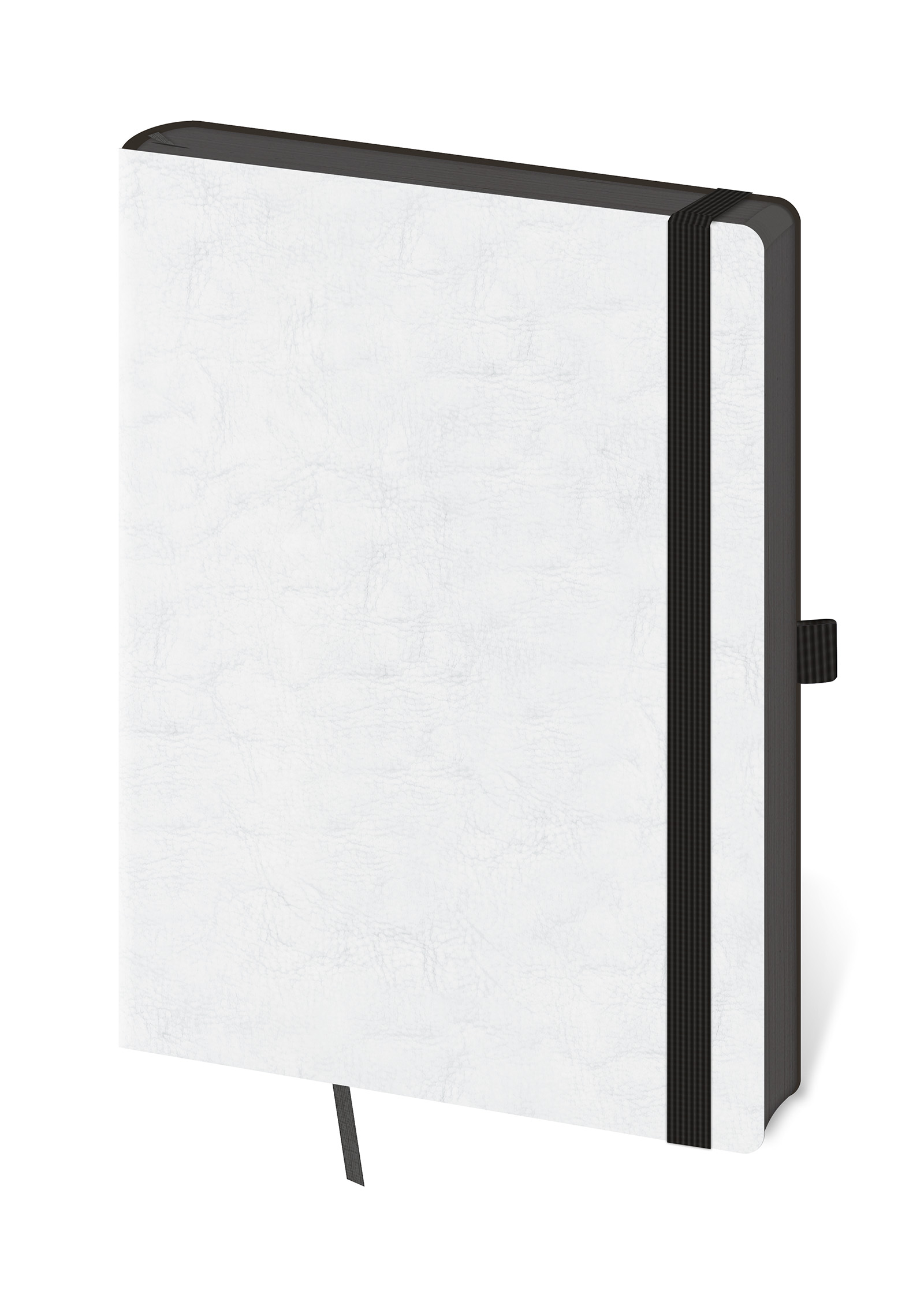 K nerozeznání od skutečné kůže, doplněný gumičkou a ořízkou bloku ve stejné barvě. Dalšími doplňky je papírová kapsa na vnitřní straně zadních desek a poutko na tužku.