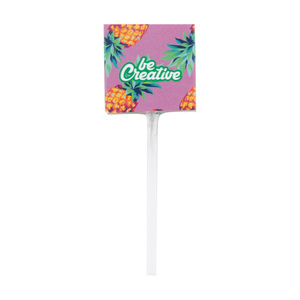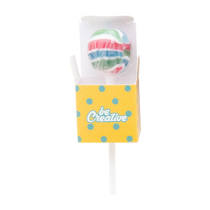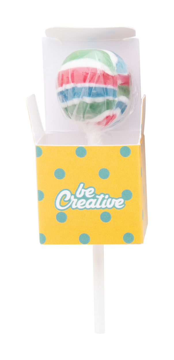 Lízátko s mix ovocnou příchutí (8 g) v papírové krabičce vyrobené na zakázku s barevným potiskem, cena nezahrnuje tiskovou přípravu. Min. mn.: 100 ks.