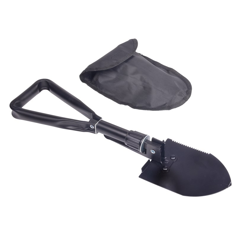 Skládací rýč s brašnou: multifunkční rýč s trojúhelníkovou rukojetí, kompaktní, lehký a přenosný, čepel s integrovanou pilkou.