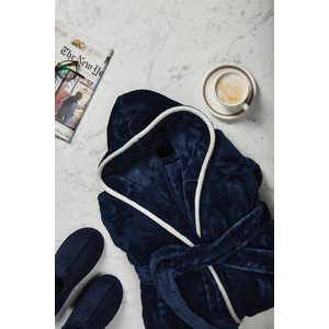 Mimořádně měkký luxusní župan s velkou kapucí a ozdobným lemováním. Dvě přední kapsy a šňůra v pase. Vyrobený z GRS recyklovaného PET. GRS (Global Recycle Standard) je globální standard, který umožňuje ověřit použití recyklovaného materiálu v produktu napříč celým dodavatelským řetězcem. Celkový podíl recyklátu dle váhy produktu: 68 %. Pro snížení objemu a uhlíkové stopy při dopravě je župan balen vakuově. OEKO-TEX Standard 100 značí, že materiál županu splňuje řadu kritérií bezpečnosti výrobku. Velikost L/XL.