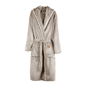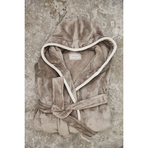 Mimořádně měkký luxusní župan s velkou kapucí a ozdobným lemováním. Dvě přední kapsy a šňůra v pase. Vyrobený z GRS recyklovaného PET. GRS (Global Recycle Standard) je globální standard, který umožňuje ověřit použití recyklovaného materiálu v produktu napříč celým dodavatelským řetězcem. Celkový podíl recyklátu dle váhy produktu: 68 %. Pro snížení objemu a uhlíkové stopy při dopravě je župan balen vakuově. OEKO-TEX Standard 100 značí, že materiál županu splňuje řadu kritérií bezpečnosti výrobku. Velikost S/M.
