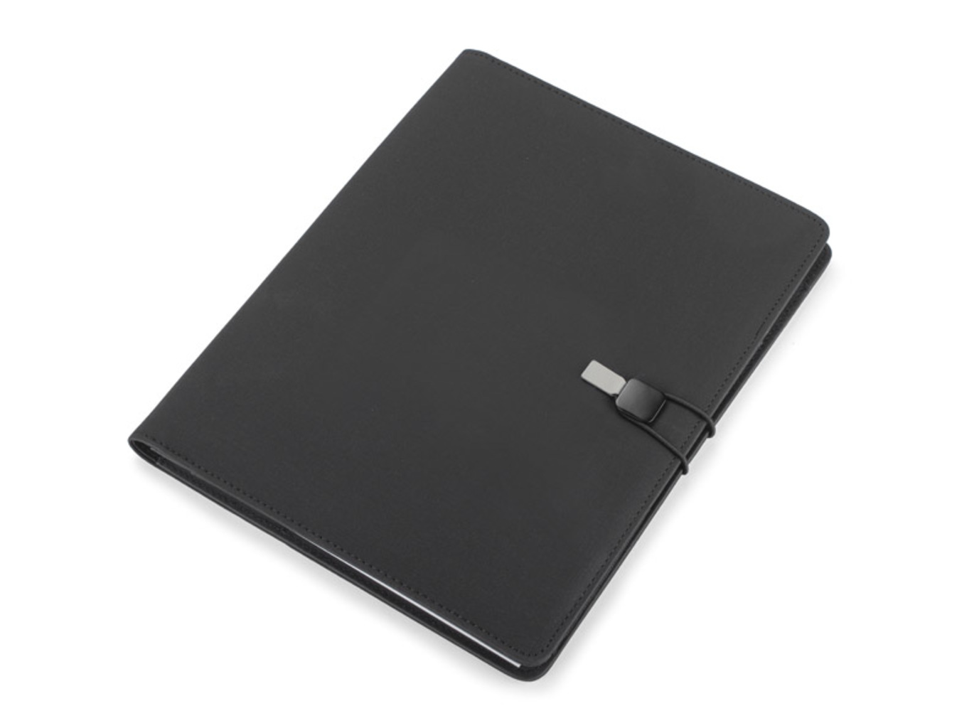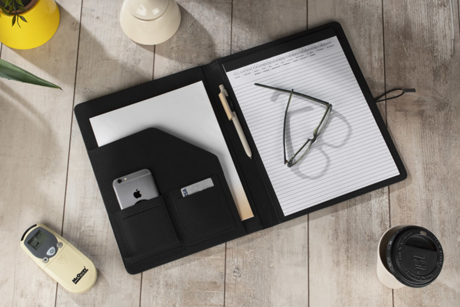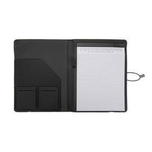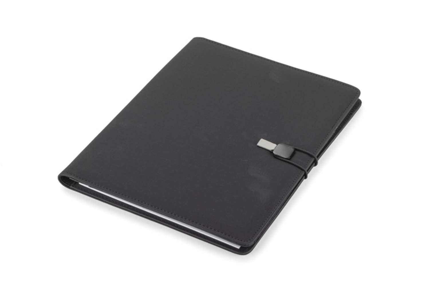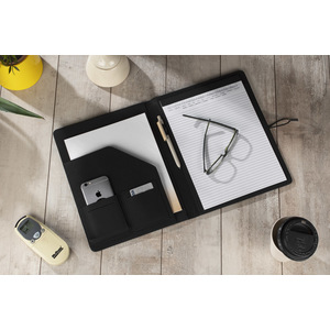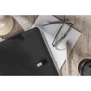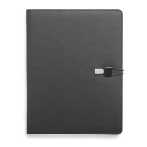 Konferenční aktovka TELLA s elastickým páskem uzavřená šedým materiálem připomínajícím kůži (PU), který usnadňuje otevírání aktovky a zároveň poskytuje zajímavý a elegantní dekor. Obsahuje jednu kapsu na dokumenty, dvě menší kapsy, prostor pro pero a vizitky a poznámkový blok formátu A4 s vyměnitelnou tužkou.