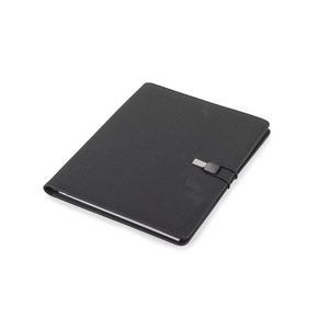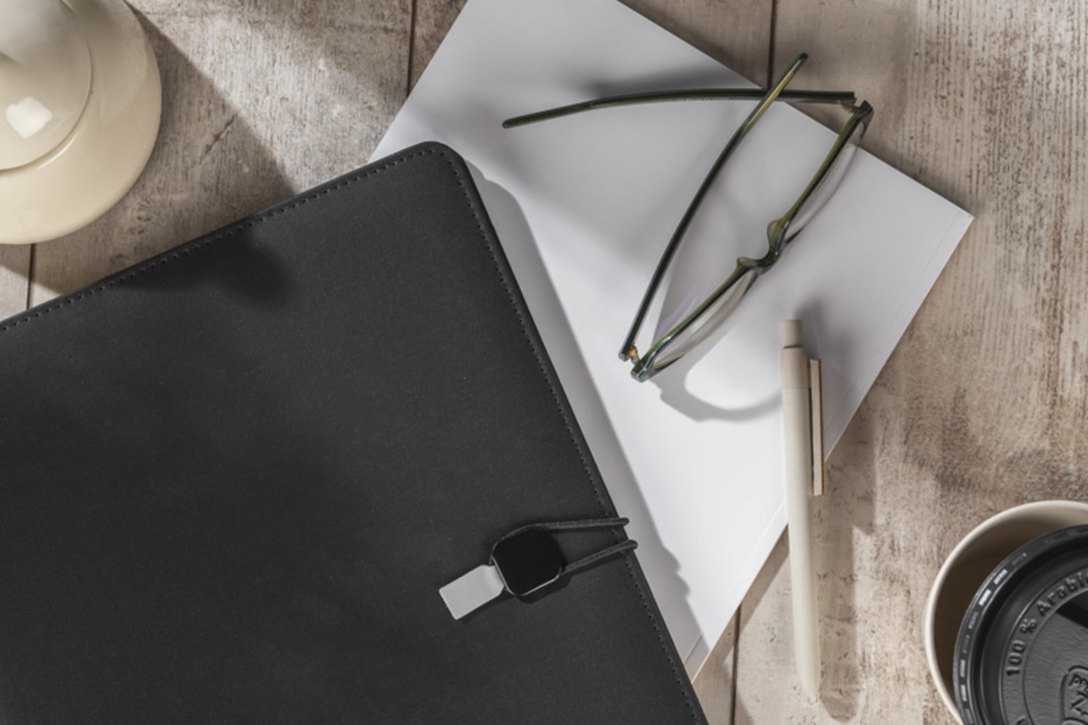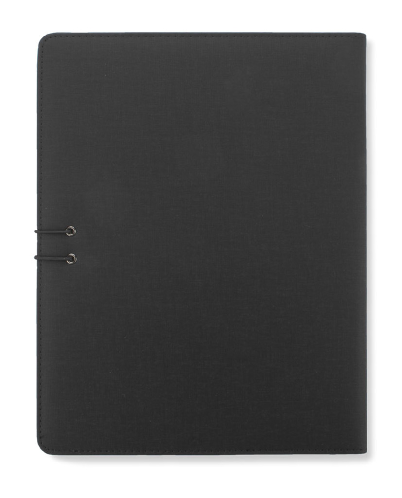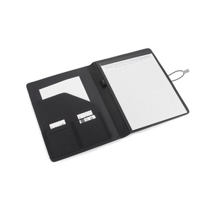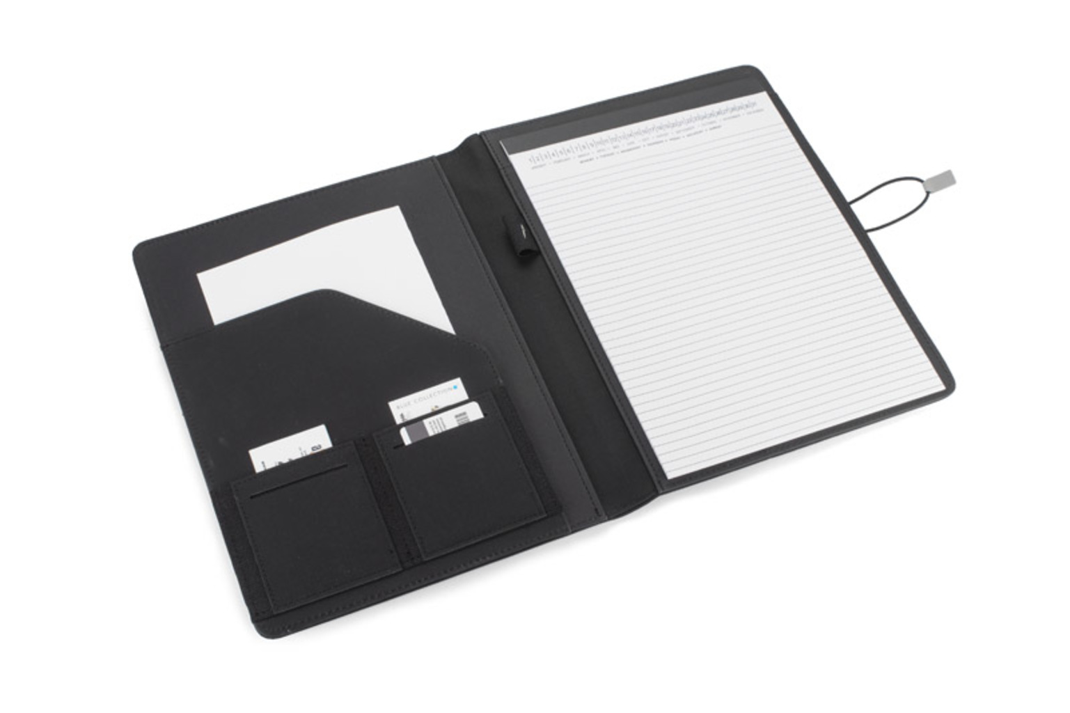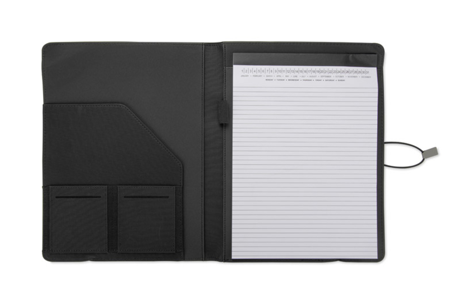 Konferenční aktovka TELLA s elastickým páskem uzavřená šedým materiálem připomínajícím kůži (PU), který usnadňuje otevírání aktovky a zároveň poskytuje zajímavý a elegantní dekor. Obsahuje jednu kapsu na dokumenty, dvě menší kapsy, prostor pro pero a vizitky a poznámkový blok formátu A4 s vyměnitelnou tužkou.