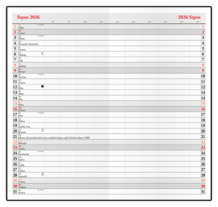 | Barva a materiál: | jemný hladký materiál PVC,potisk roku bílou barvou, šitá vazba V1, ofset, 70g/m2 | ||||||||||||||