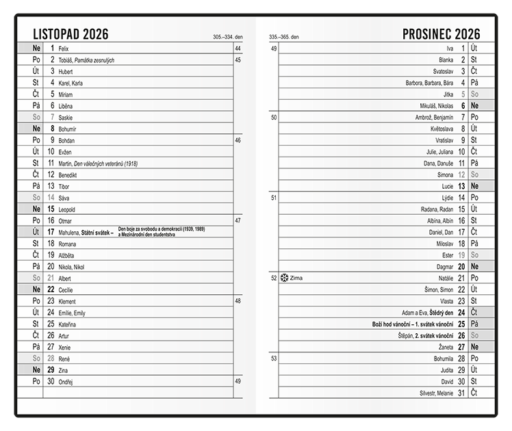 | Barva a materiál: | jemný hladký materiál PVC,potisk roku bílou barvou, šitá vazba V1, ofset, 70g/m2 | ||||||||||||||