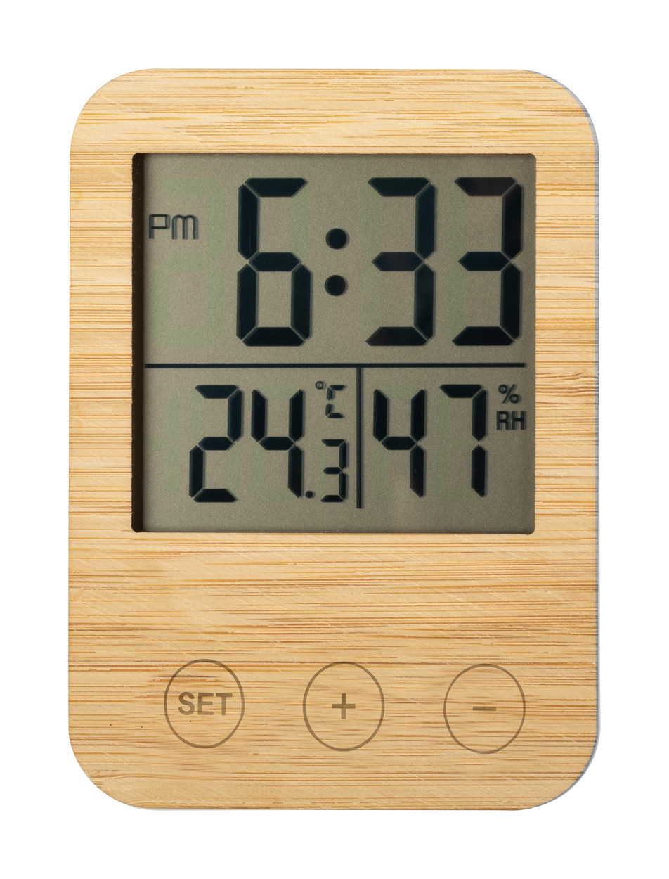 Bambusové digitální hodiny a meteorologická stanice s displejem teploty a vlhkosti. Pracuje se 2 AAA bateriemi, bez baterií.