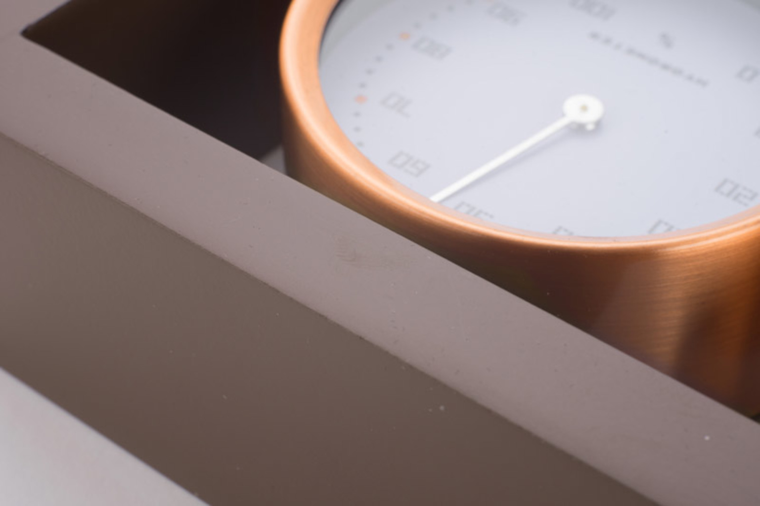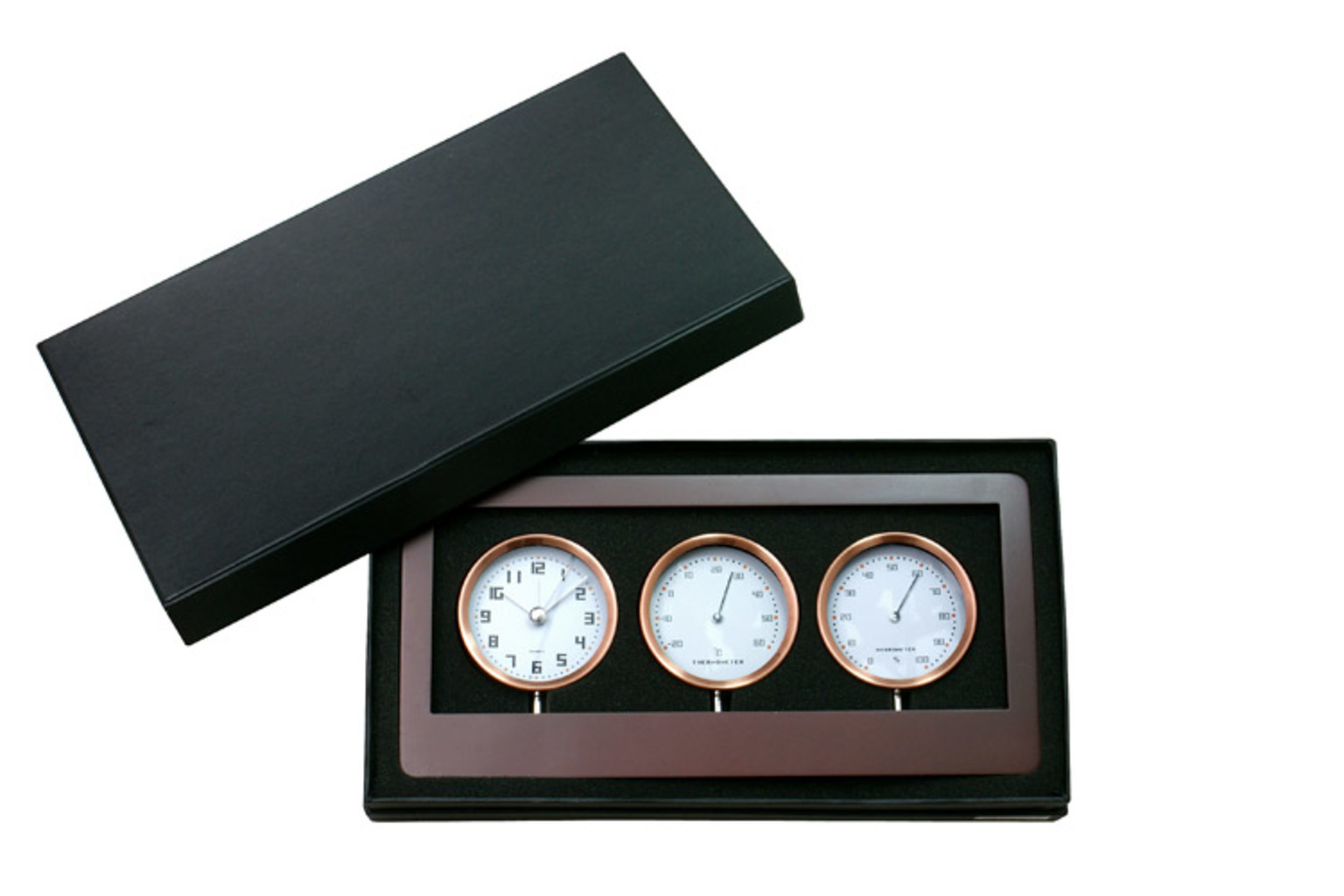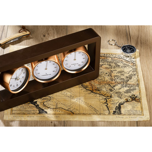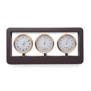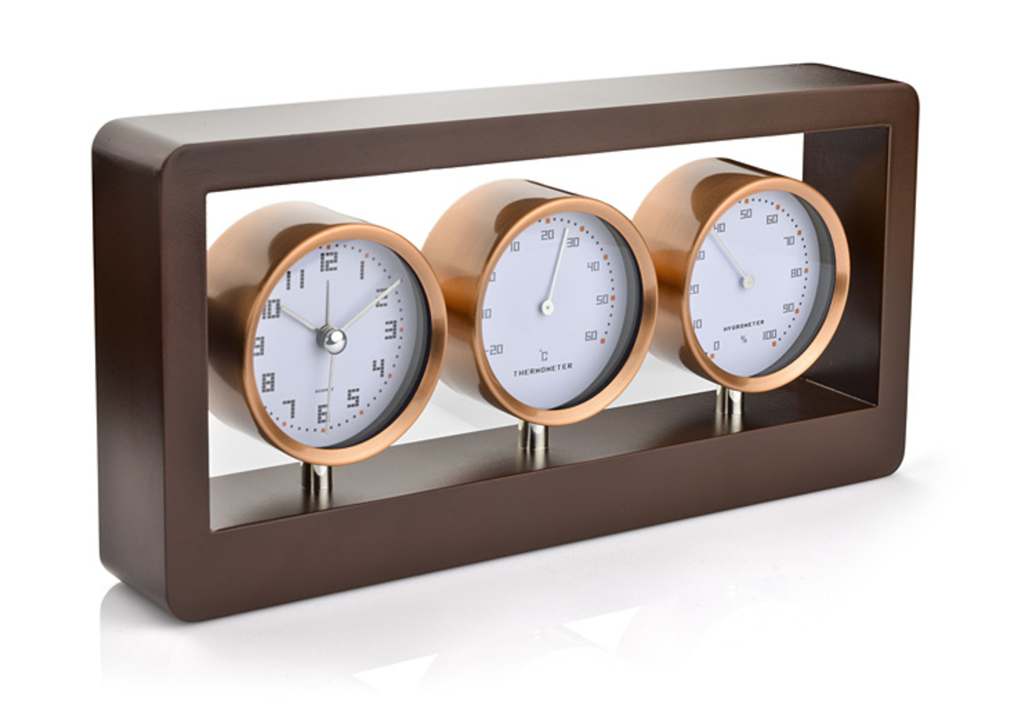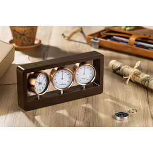 Hodiny s budíkem, teploměrem a vlhkoměrem umístěné do dřevěného pouzdra. K provozu je potřeba 1 ks AA baterie, která není součástí předmětu.