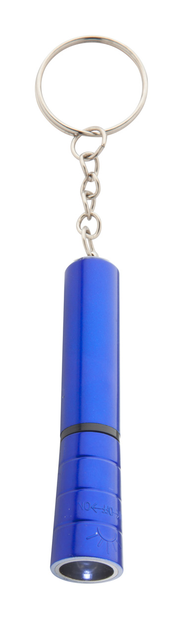 Plastová mini baterka s kovovým vzhledem s bílým LED světlem a kovovým přívěškem na klíče. Včetně knoflíkové baterie.