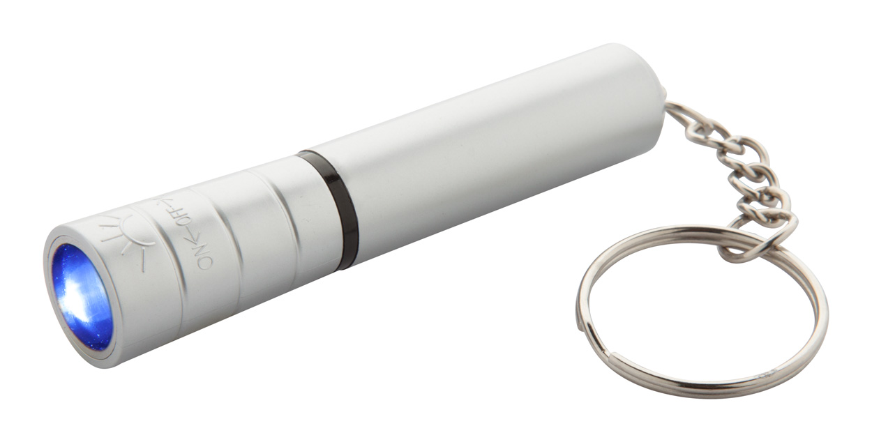 Plastová mini baterka s kovovým vzhledem s bílým LED světlem a kovovým přívěškem na klíče. Včetně knoflíkové baterie.