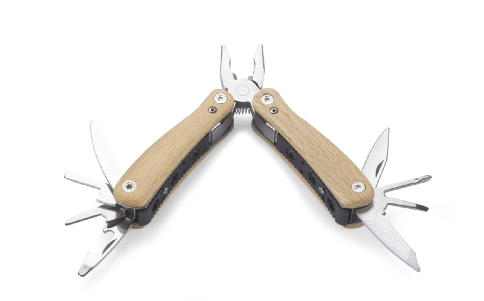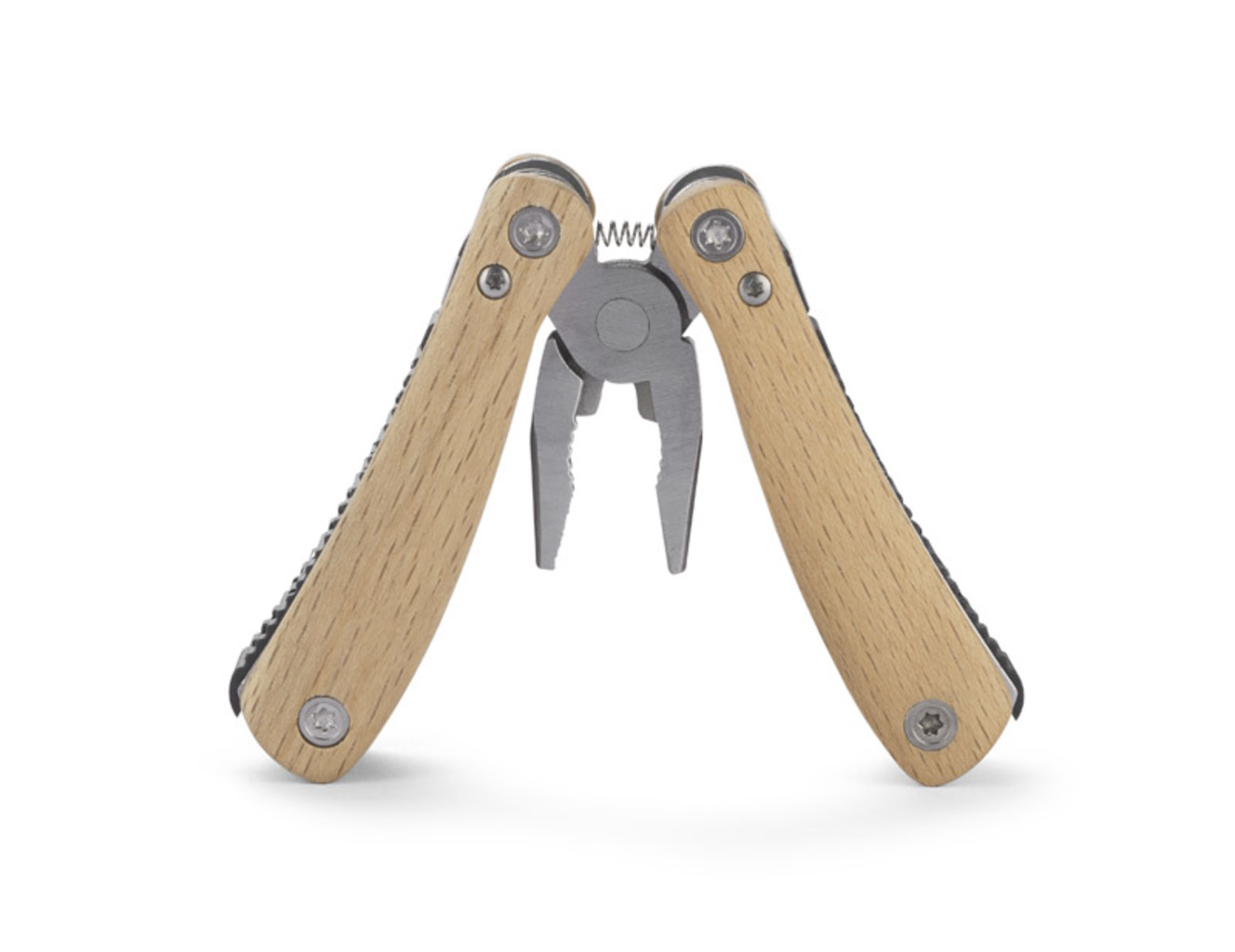 Multifunkční nářadí FORT je kapesní nářadí s dřevěnou povrchovou úpravou. Funkce: kleště, štípací kleště, nůž, plochý a křížový šroubovák, pilník, pilka, otvírák na lahve a konzervy. Součástí sady je také černé látkové pouzdro na nářadí.