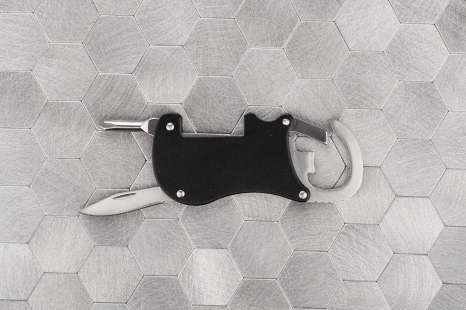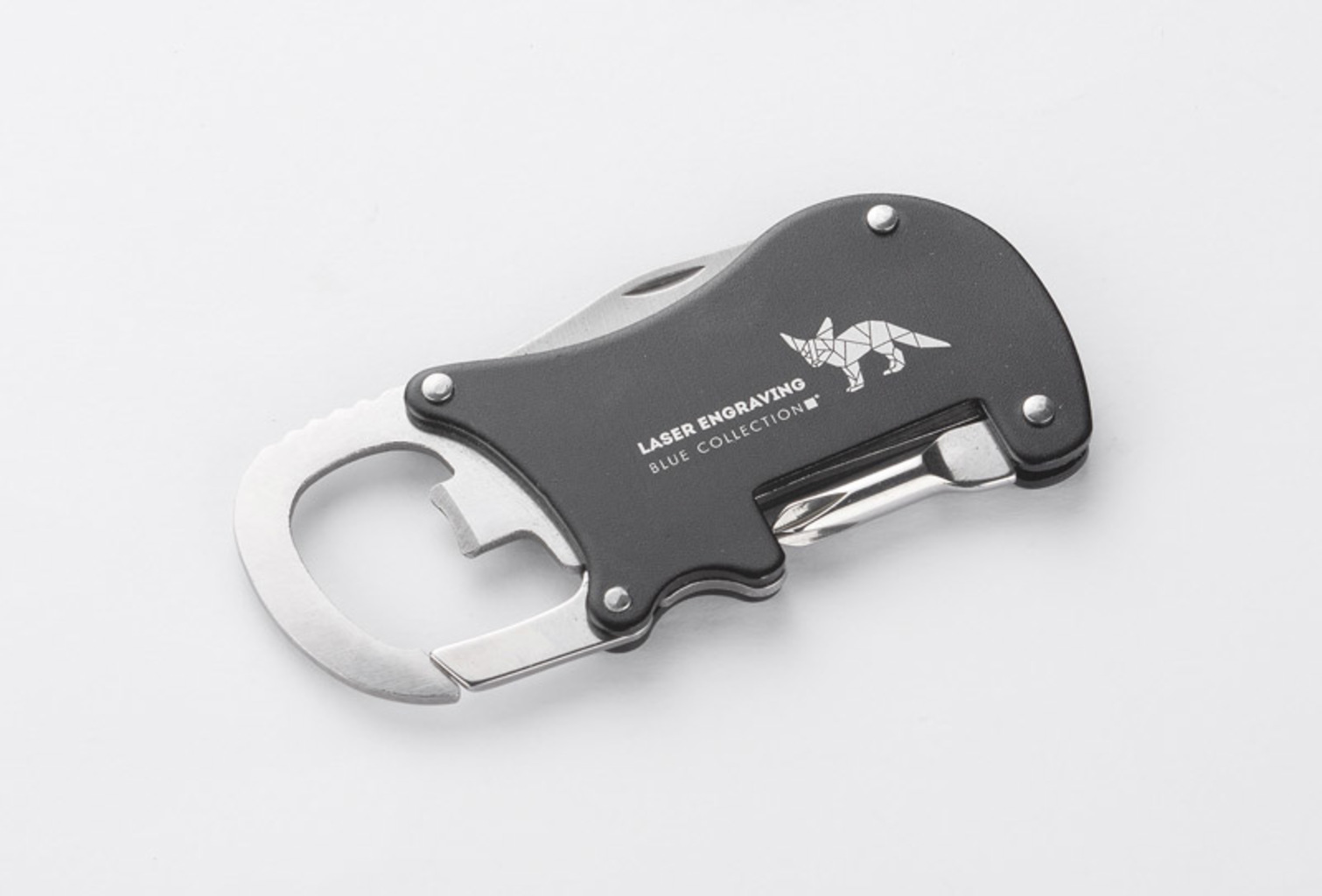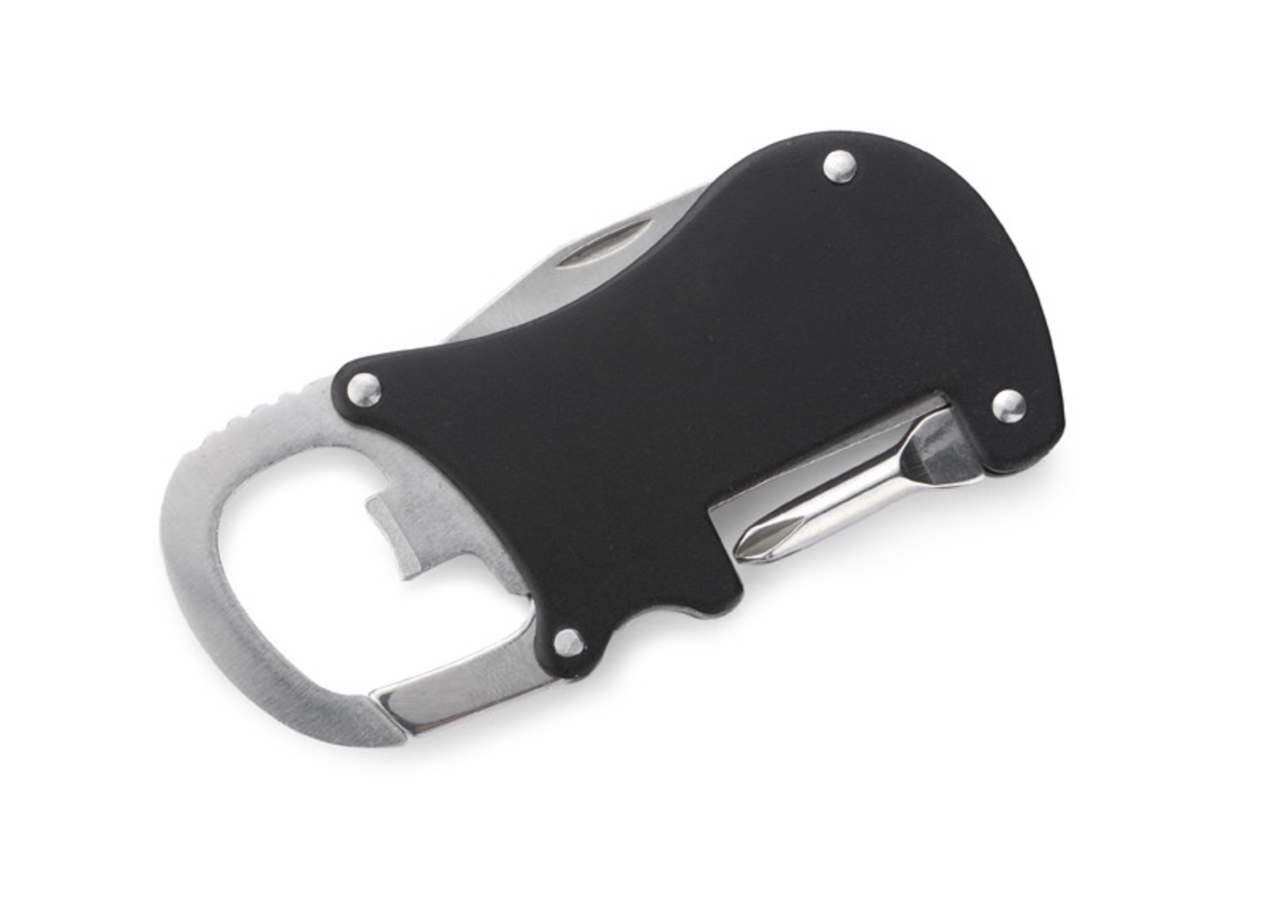 GO je kapesní nástroj, který je dodávány s nožem, křížovým šroubovákem, otvírákem na láhve a karabinou.Všechno je vyrobeno z kovu.