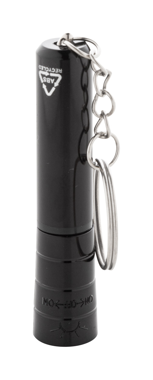 Mini baterka s 1 LED, z recyklovaného ABS plastu s kovovým povrchem a kovovým kroužkem na klíče. S knoflíkovou baterií.
