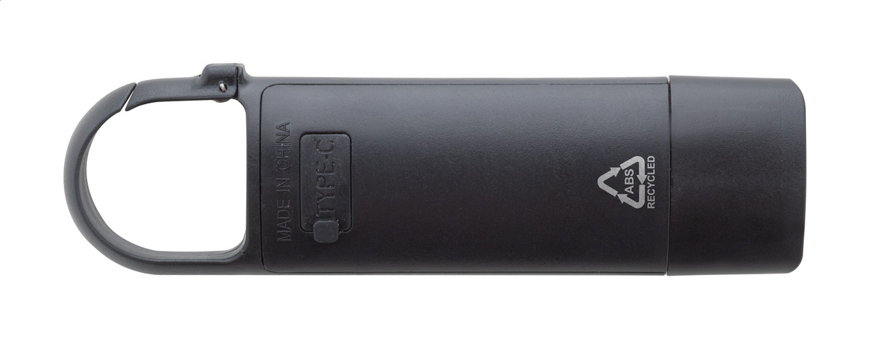 Recyklovaná ABS mini baterka s vestavěnou USB dobíjecí baterií (200 mAh) a karabinou. S COB světlem u písma a COB reflektorem na straně. Se 3 režimy svícení. Včetně USB nabíjecího kabelu.