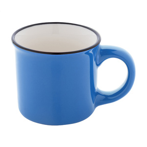 Mini vintage keramický hrnek s černým okrajem, bílým uvnitř a barevným vnějškem, 90 ml. V krabičce z kraftového papíru.