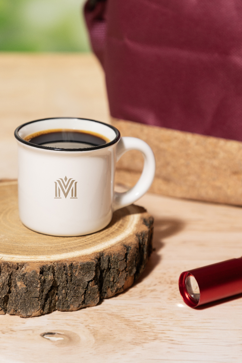 Mini vintage keramický hrnek s černým okrajem, bílým uvnitř a barevným vnějškem, 90 ml. V krabičce z kraftového papíru.