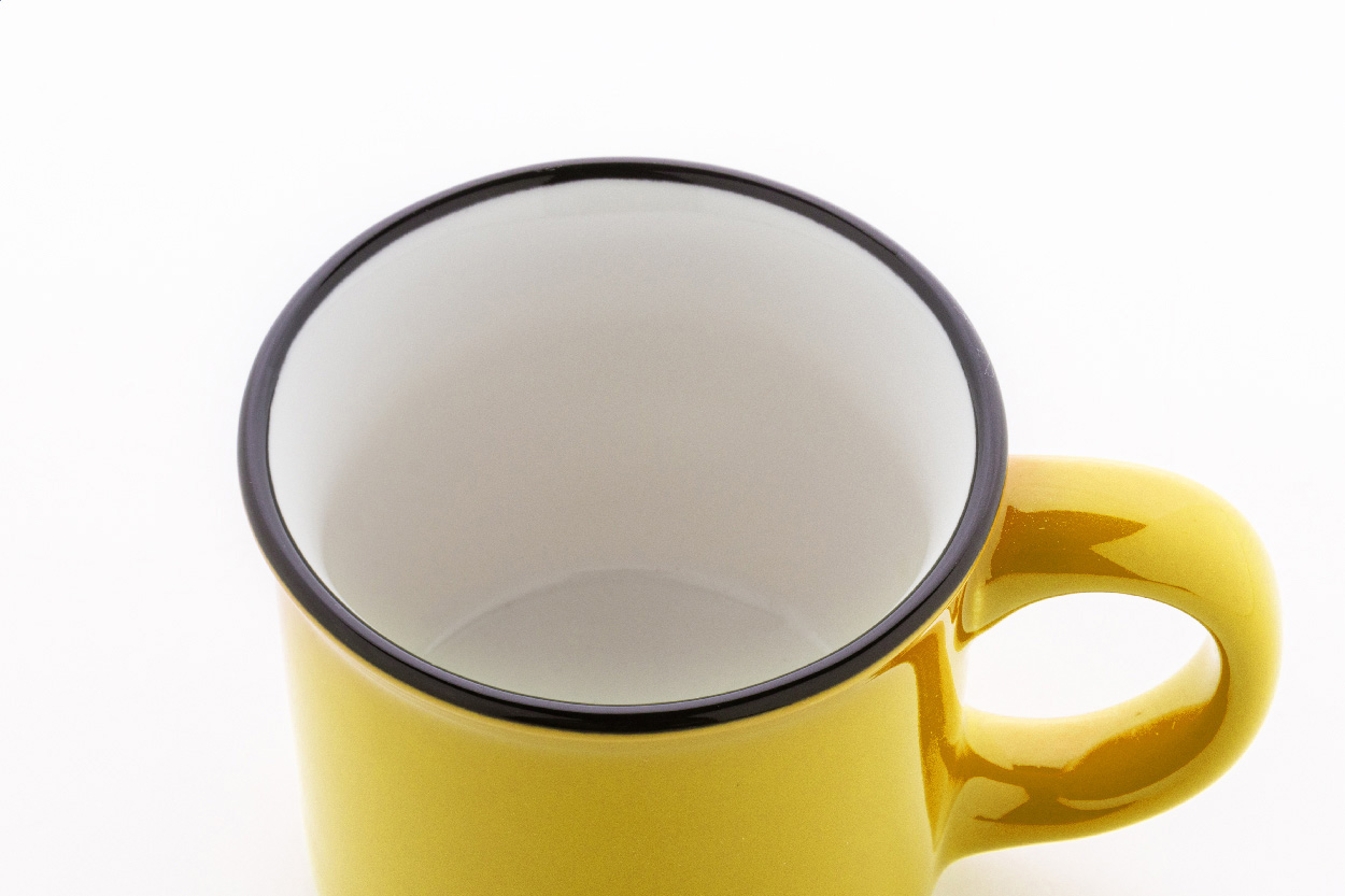 Mini vintage keramický hrnek s černým okrajem, bílým uvnitř a barevným vnějškem, 90 ml. V krabičce z kraftového papíru.