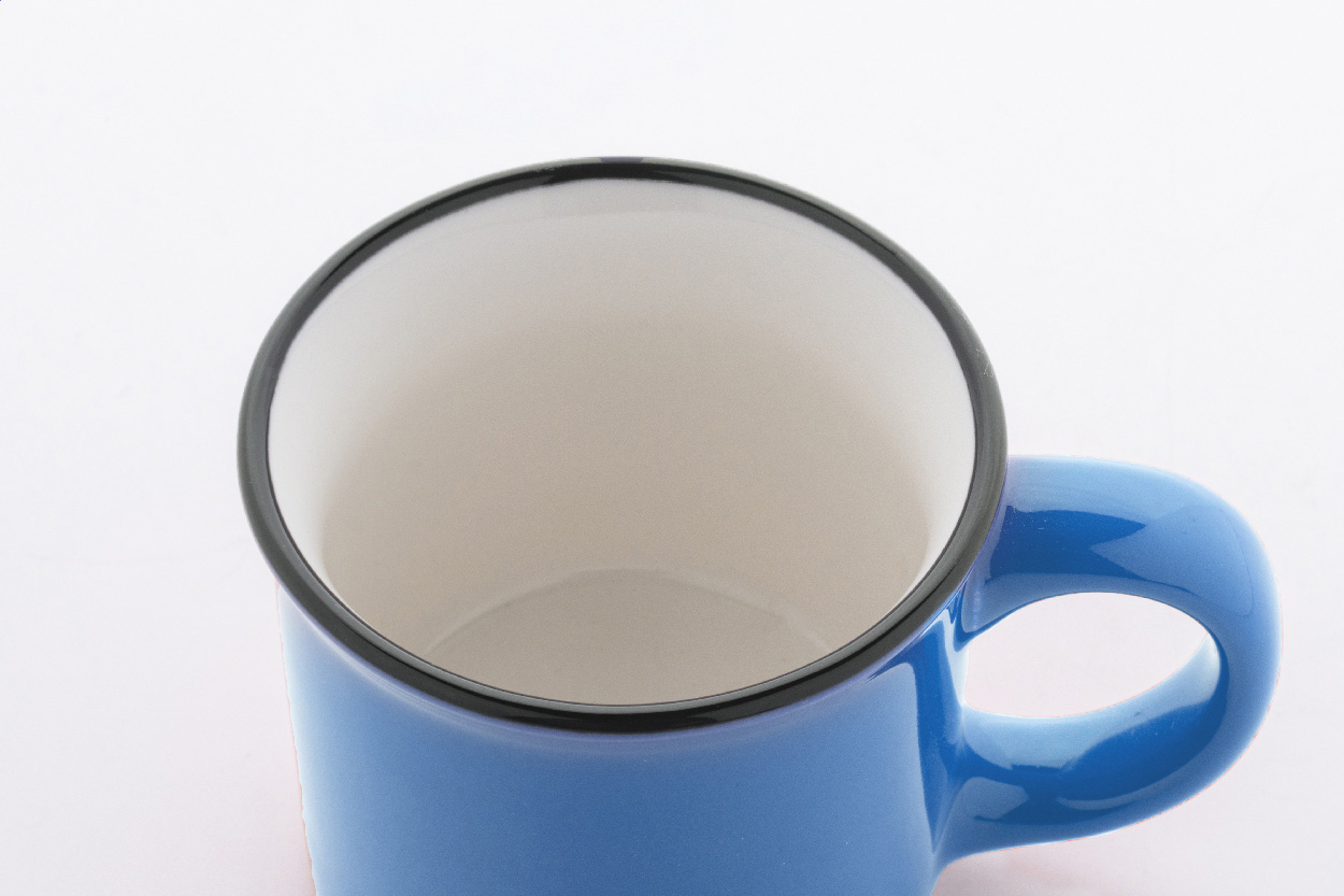 Mini vintage keramický hrnek s černým okrajem, bílým uvnitř a barevným vnějškem, 90 ml. V krabičce z kraftového papíru.