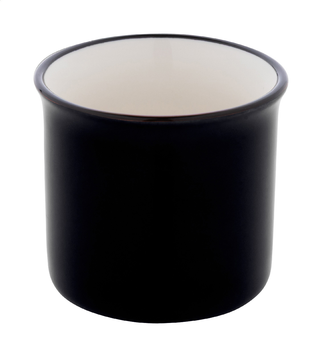 Mini vintage keramický hrnek s černým okrajem, bílým uvnitř a barevným vnějškem, 90 ml. V krabičce z kraftového papíru.
