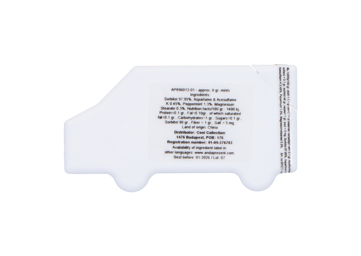 Plastový dávkovač mintových bonbónů ve tvaru auta s cca. 8 gramů mentolových bonbonů bez cukru.