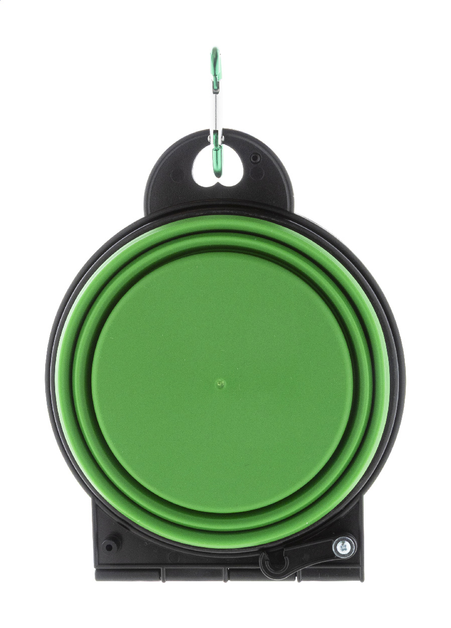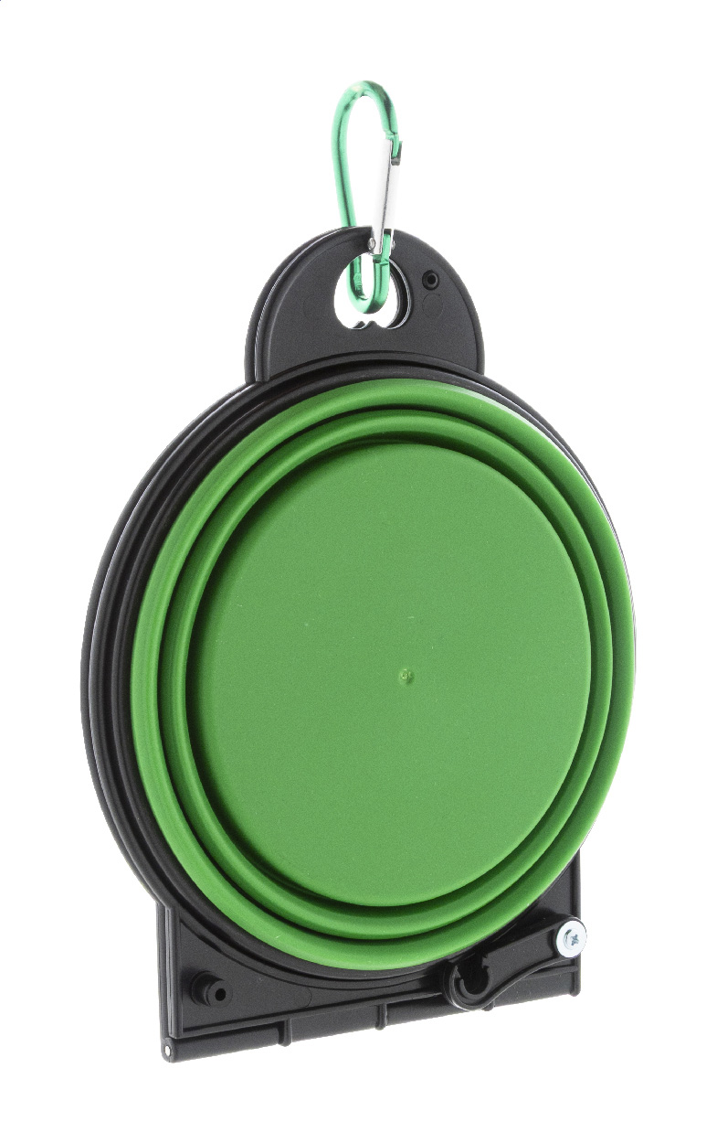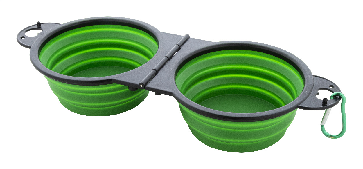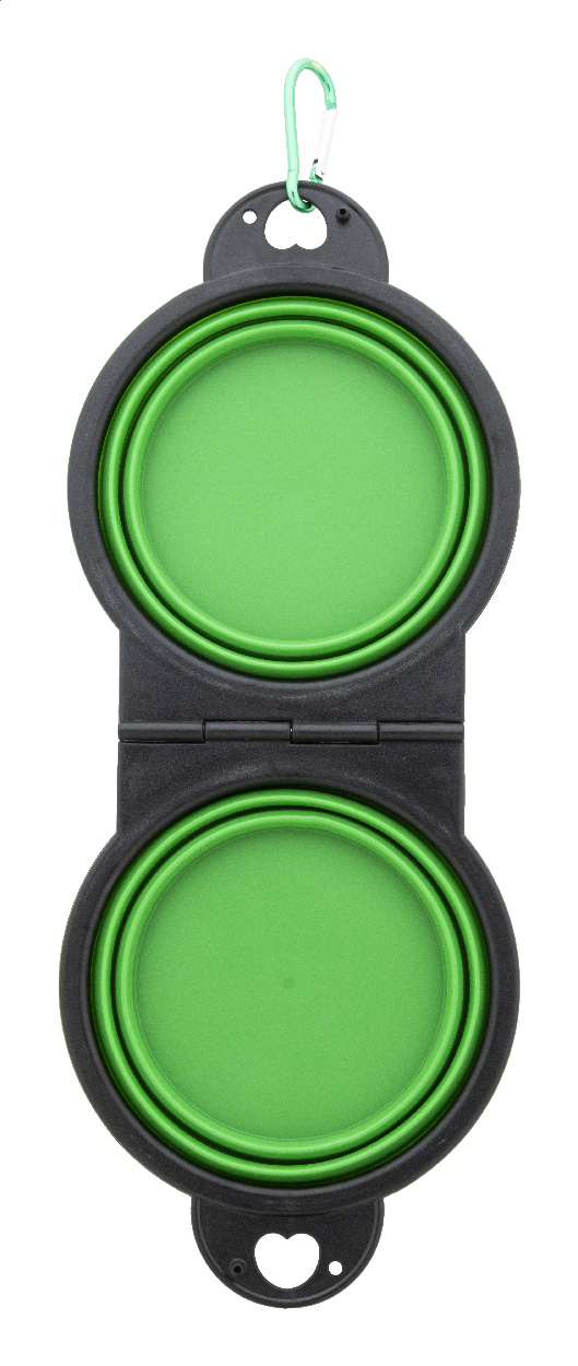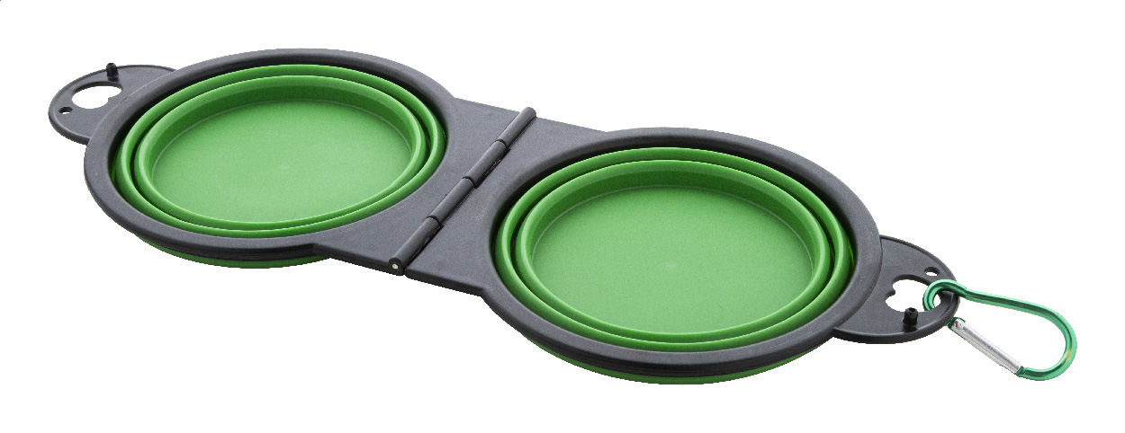 Skládací miska pro domácí mazlíčky z odolného TPE se dvěma přihrádkami o objemu 450 ml a barevně sladěnou hliníkovou karabinou.