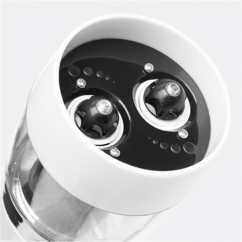 Mlýnek na sůl a pepř s robustním keramickým mlýnkem a okénkem, ovládá se stisknutím tlačítka, dodává se v kufříku.