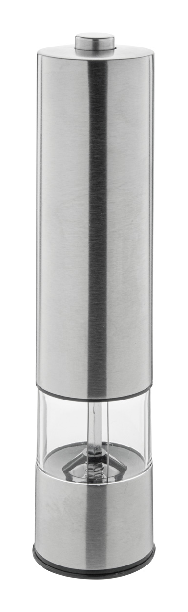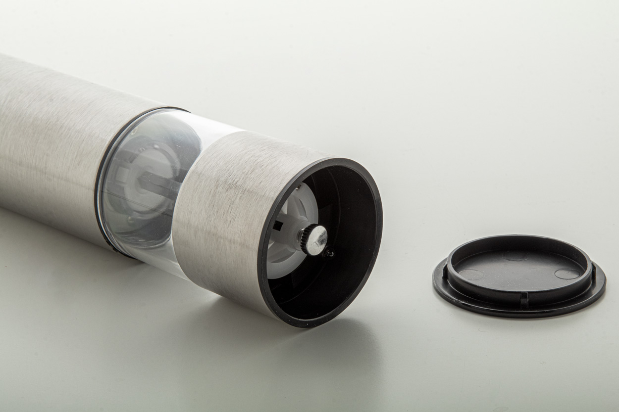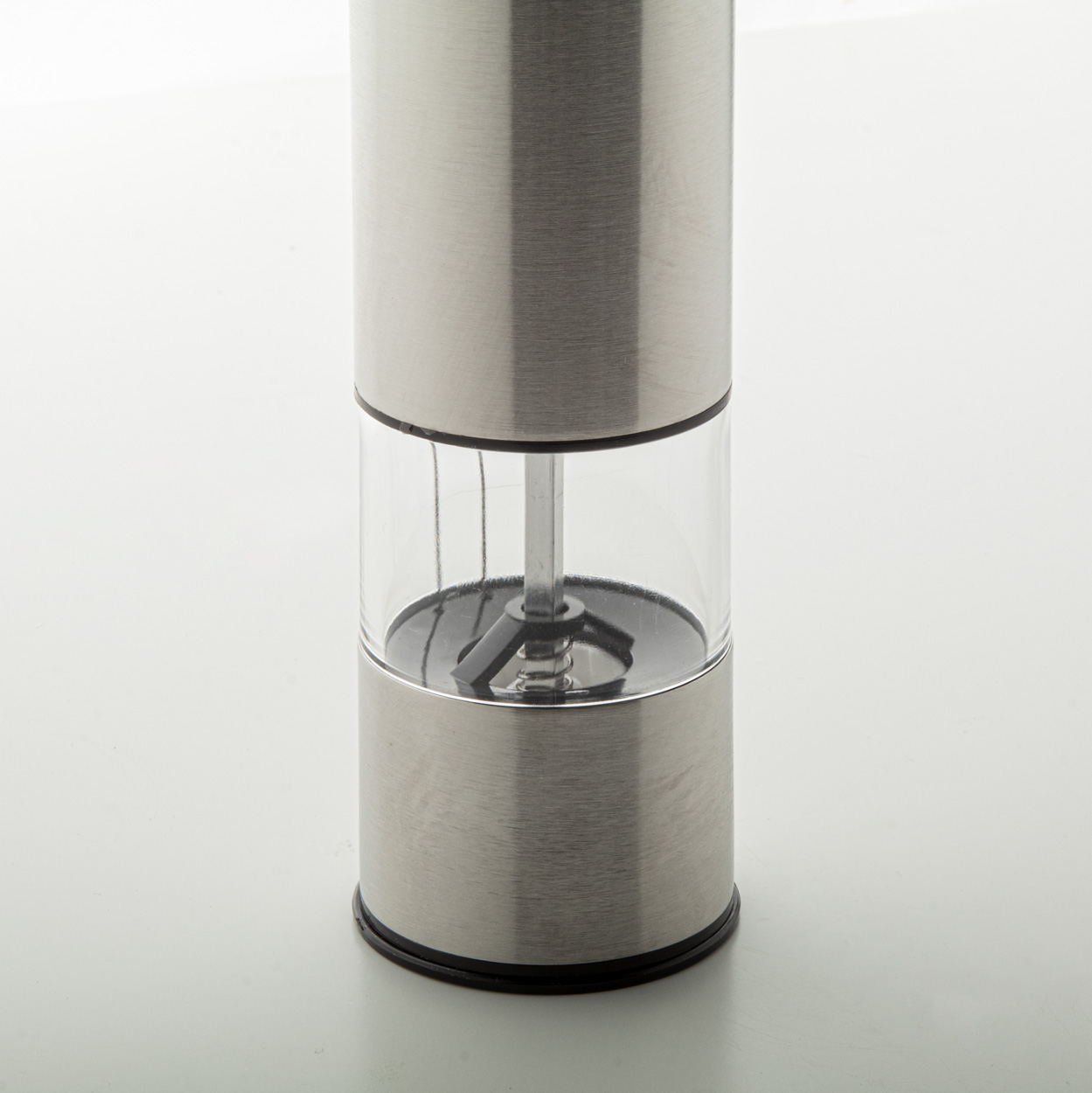 Nerezový elektrický mlýnek na sůl a pepř s keramickým jádrem mlýnku a LED osvětlením. Funguje na 4 AA baterie, bez baterií.