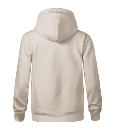 bez etikety - připraveno na rebranding, volný střih s bočními švy, kapuce s podšívkou, na stažení šňůrkou, neutrální velikostní štítek v boční části průkrčníku, vnitřní část průkrčníku začištěna páskou v barvě vrchového materiálu, nízkohlavicové rukávy, lištové kapsy ve stylu klokanky, dolní lem a manžety rukávů z žebrového úpletu 2:2 s 5 % elastanu, vnitřní strana počesaná
