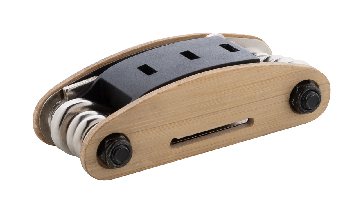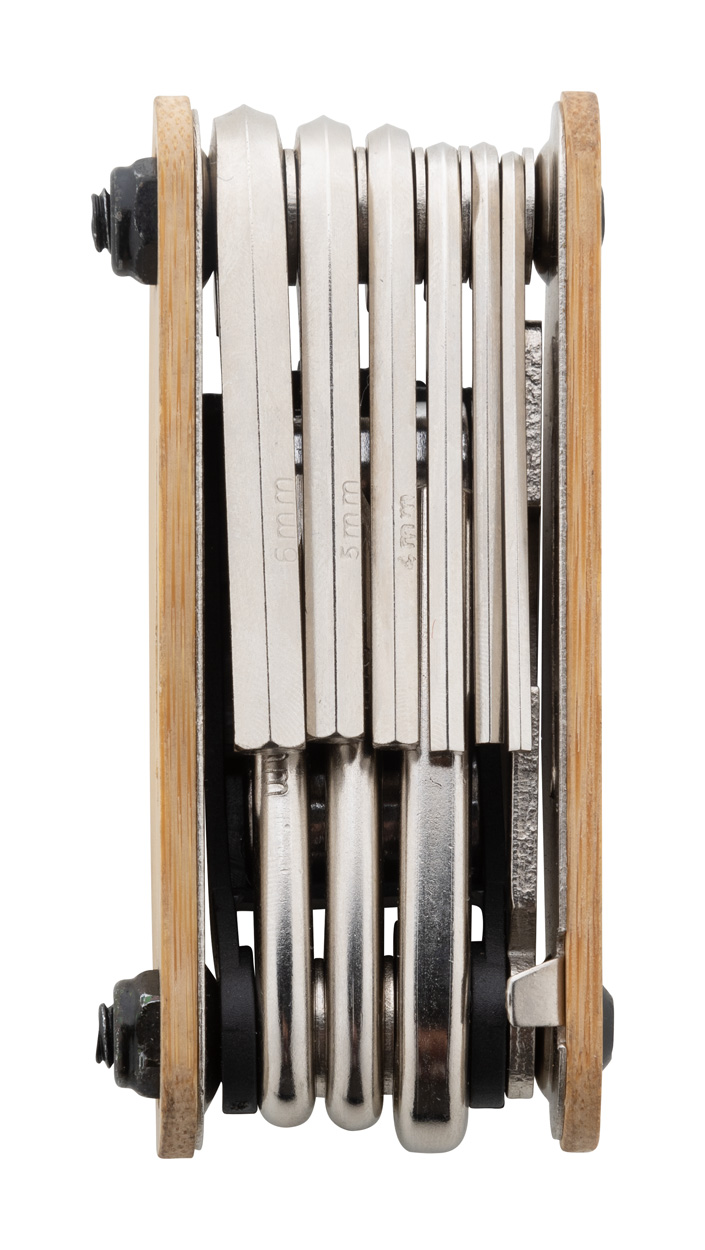 Multifunkční nářadí z nerezové oceli s bambusovou rukojetí a 14 funkcemi. Obsahuje ploché a křížové šroubováky, 5 šestihranných klíčů, 3 nástrčné klíče s prodlužovací lištou a 4 ploché klíče.