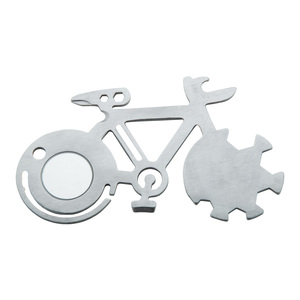 Multifunkční nářadí ve tvaru kola z nerezové oceli s 11 funkcemi.