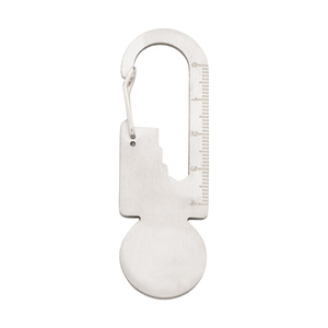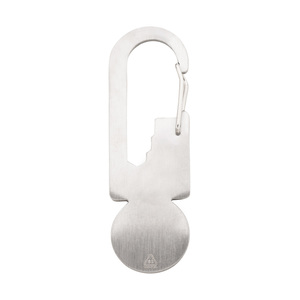 Multifunkční nástroj z recyklované nerezové oceli s karabinou, žetonem do nákupního vozíku, pravítkem a 3 plochými klíči.