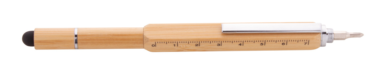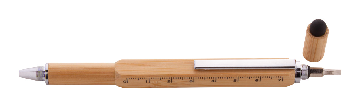 Multifunkční otočné kuličkové a dotykové pero z bambusu. S oboustranným šroubovákem, vodováhou a pravítkem 7 cm. S modrou náplní.