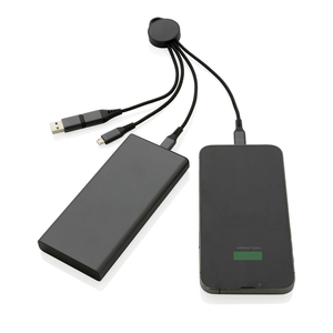 Nabíjecí kabel 6 v 1 vyrobený z RCS recyklovaného hliníku, recyklovaného TPE a recyklovaného PET. RCS (Recycled Claim Standard) je globální standard, který umožňuje ověřit použití recyklovaného materiálu v produktu napříč celým dodavatelským řetězcem. Podíl použitého recyklovaného materiálu vzhledem k celkové váze produktu: 68 %. Hliník při recyklaci neztrácí své vlastnosti, lze tak recyklovat opakovaně. Kabel disponuje 5 konektory: USB C/USB A vstup, USB C/micro USB/iOS výstup. USB C je vhodné pro nabíjení moderních telefonů, ale i MacBooků. USB A má dvojí funkci (vstup i výstup) pro nabíjení jakéhokoliv zařízení z jakéhokoliv jiného zdroje. PET opletené kabely délky 12 cm. Vodné pro nabíjení i přenos dat. Podporuje rychlonabíjení 9V/2A. Baleno v FSC® dárkovém balení.