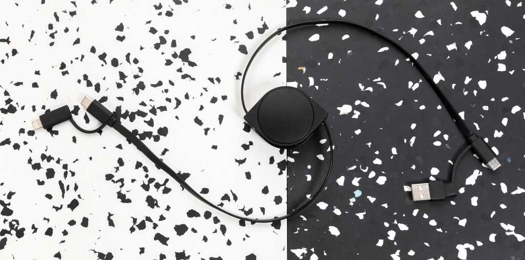 Svinovací nabíjecí kabel 6 v 1. Pouzdro vyrobené z recyklovaného ABS plastu s RCS certifikací, kabel z recyklovaného TPE. RCS (Recycled Claim Standard) je globální standard, který umožňuje ověřit použití recyklovaného materiálu v produktu napříč celým dodavatelským řetězcem. Celkový podíl recyklátu dle váhy produktu: 59 %. Kabel disponuje 5 konektory: USB C/USB A vstup, USB C/micro USB/iOS výstup. USB C je vhodné pro nabíjení moderních telefonů, ale i MacBooků. USB A má dvojí funkci (vstup i výstup) pro nabíjení jakéhokoliv zařízení z jakéhokoliv jiného zdroje. Výrobek je kompletně bez PVC.
