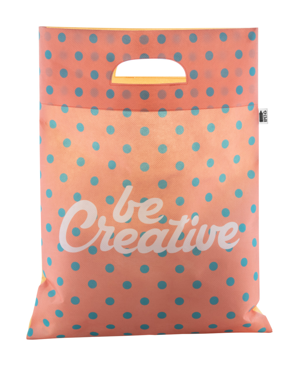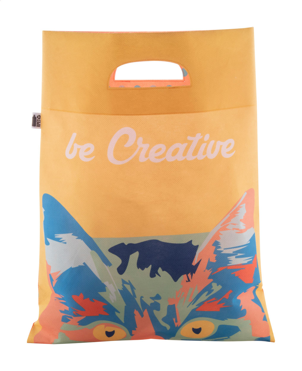 Nákupní taška z netkané textilie RPET s proseklými uchy na zakázku, 80 g/m², s etiketou s označením RPET. Cena zahrnuje celoplošný sublimační tisk, nezahrnuje tiskovou přípravu. Min. mn.: 50 ks.