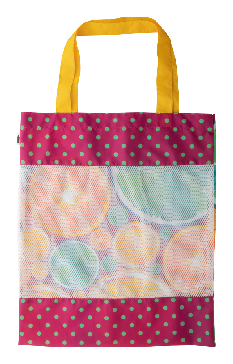 Nákupní taška na zakázku z polyesteru 190T RPET, s přední částí z polyesterové síťoviny a dlouhými uchy, s výrazným štítkem RPET. Cena zahrnuje sublimační tisk po celé ploše (kromě síťové části), nezahrnuje tiskovou přípravu. Min. mn.: 50 ks.