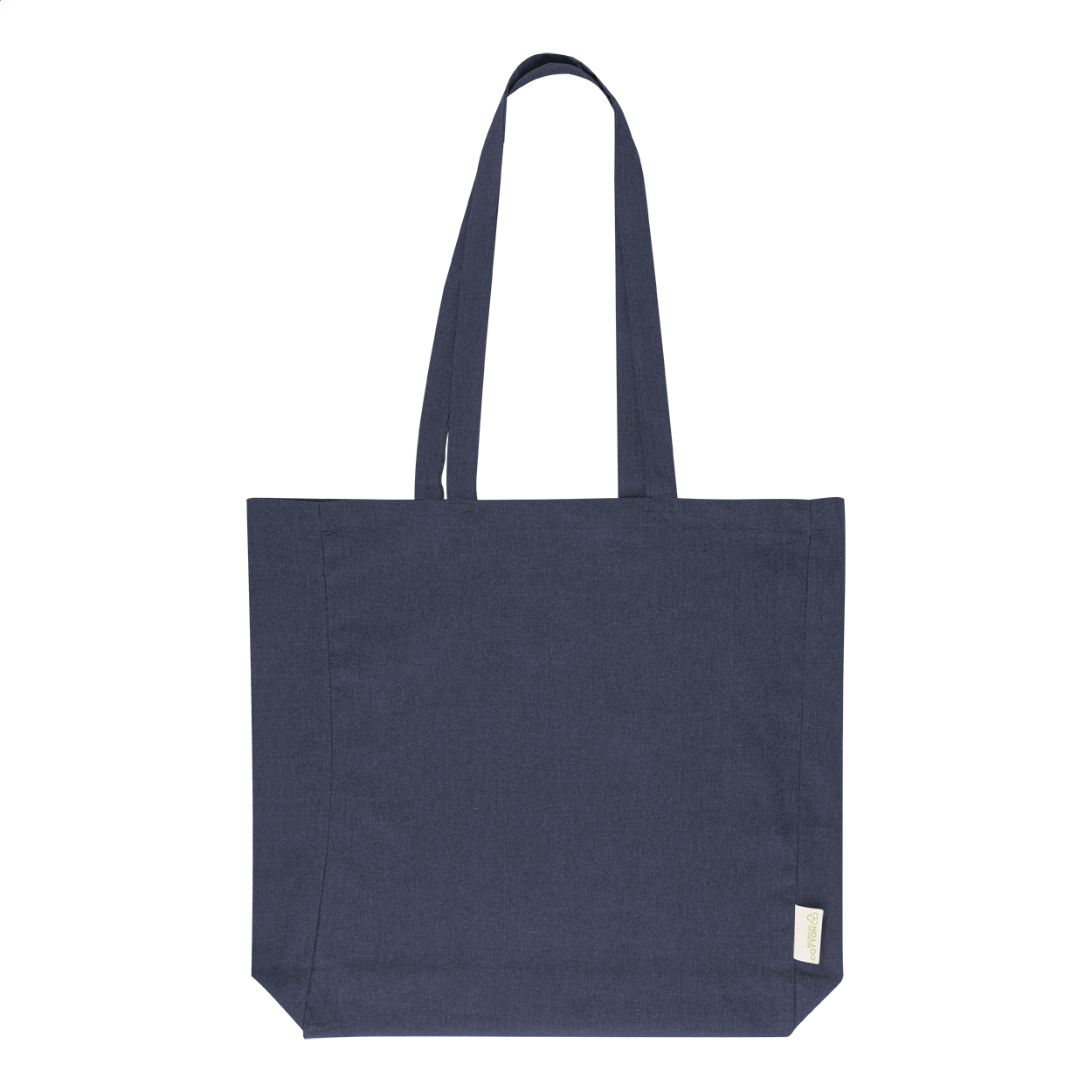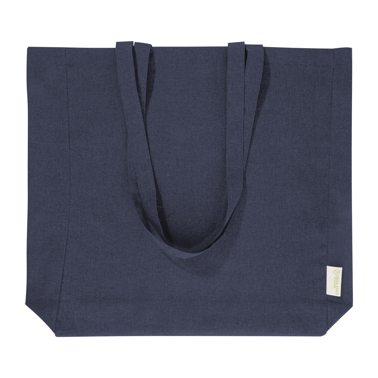 Nákupní taška s klínkem a dlouhými uchy ze 70 % recyklované bavlny a 30 % RPET polyesteru, 140 g/m². S výraznou etiketou o recyklované bavlně.