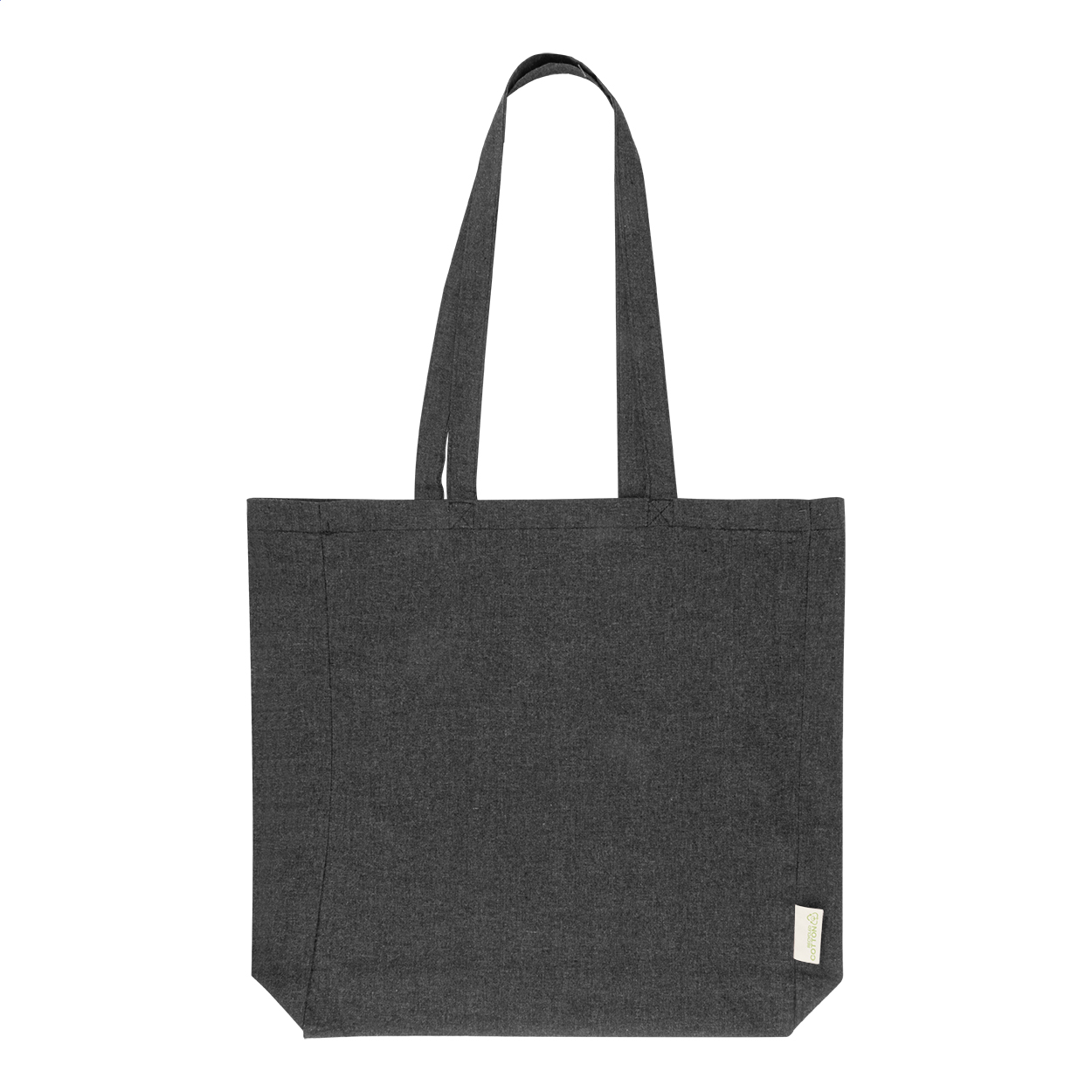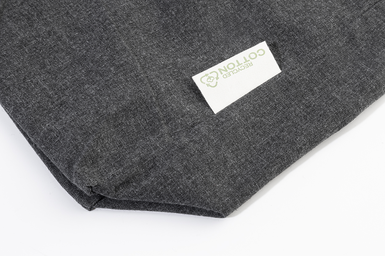 Nákupní taška s klínkem a dlouhými uchy ze 70 % recyklované bavlny a 30 % RPET polyesteru, 140 g/m². S výraznou etiketou o recyklované bavlně.