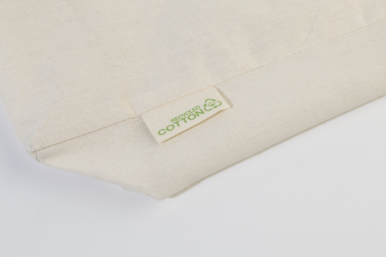 Nákupní taška s klínkem a dlouhými uchy ze 70 % recyklované bavlny a 30 % RPET polyesteru, 140 g/m². S výraznou etiketou o recyklované bavlně.