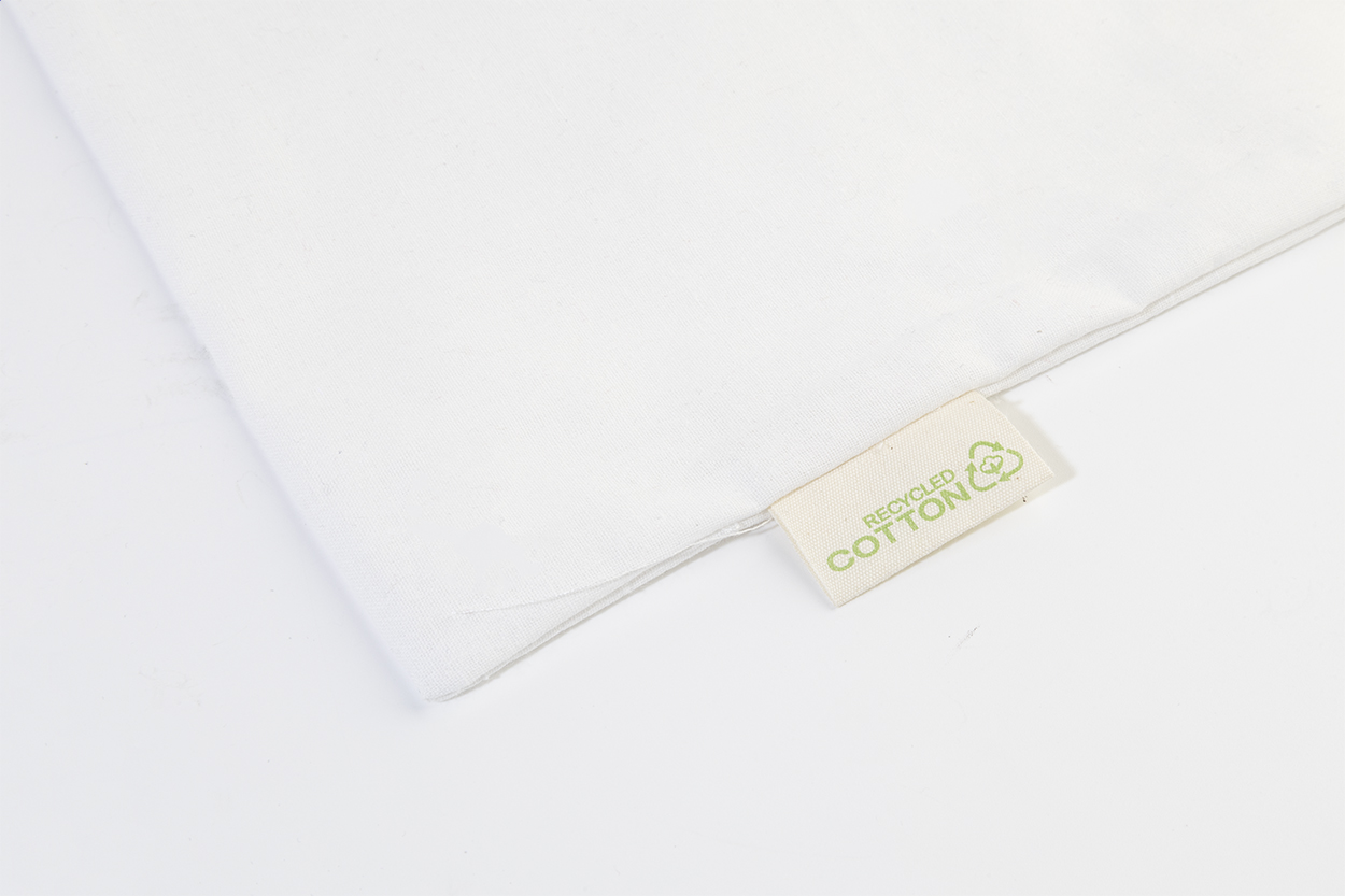 Nákupní taška s dlouhými uchy ze 70 % recyklované bavlny a 30 % RPET polyesteru, 140 g/m². S výraznou etiketou o recyklované bavlně.