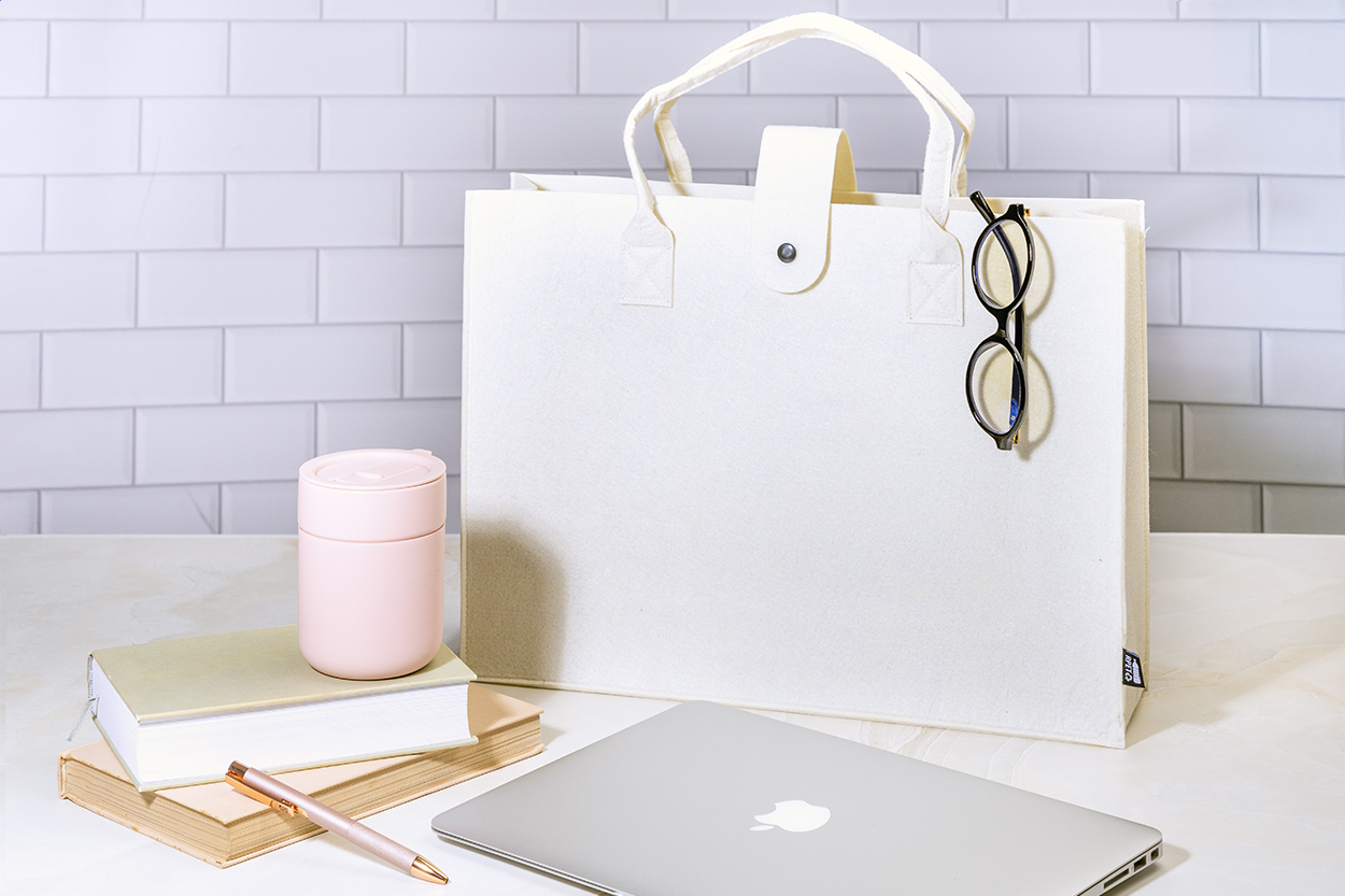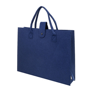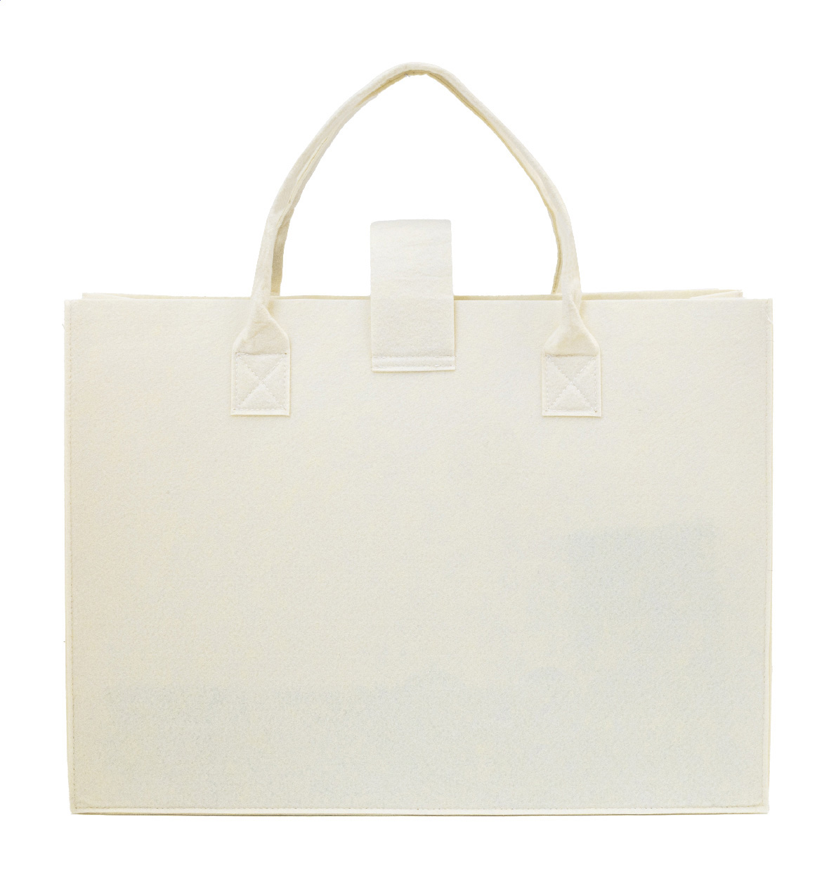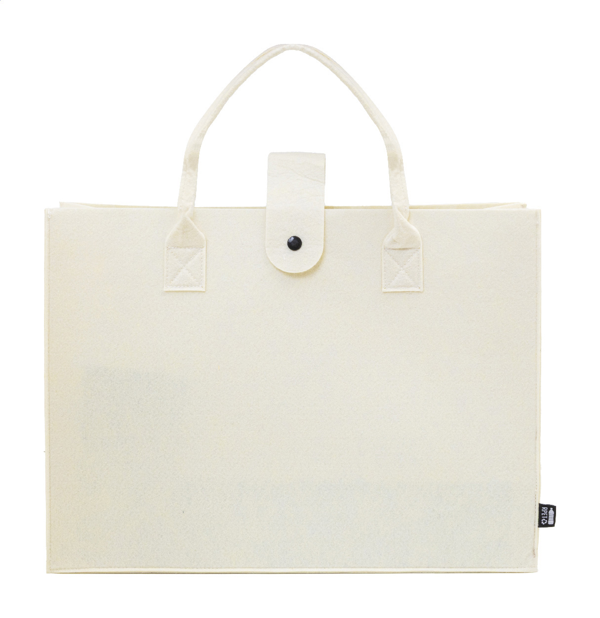 Nákupní taška z RPET plsti s klínkem, zapínáním na knoflíky a krátkými uchy. S výraznou etiketou z RPET.