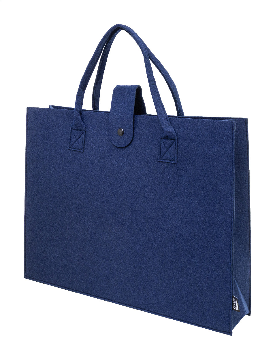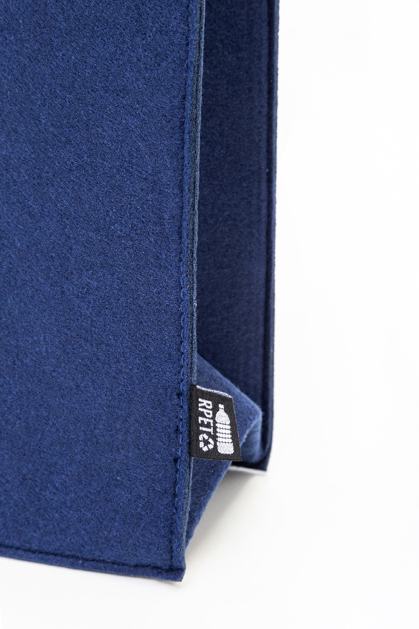 Nákupní taška z RPET plsti s klínkem, zapínáním na knoflíky a krátkými uchy. S výraznou etiketou z RPET.