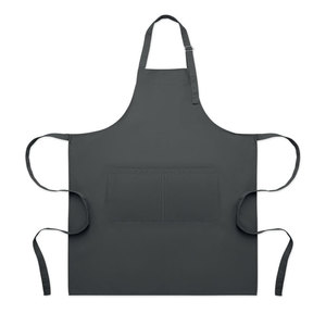 Dlouhá nastavitelná kuchyňská zástěra z polybavlny o gramáži 240 gr/m² (35 % bavlna, 65 % polyester) se dvěma předními kapsami a nastavitelným popruhem s kovovou sponou.