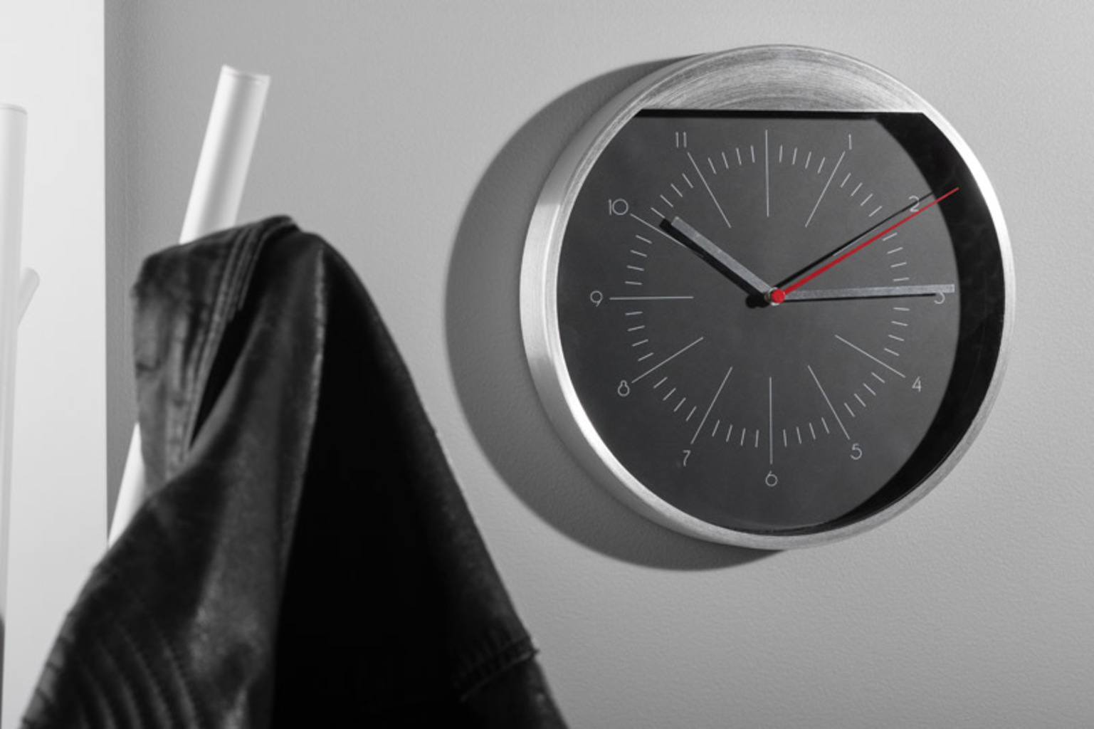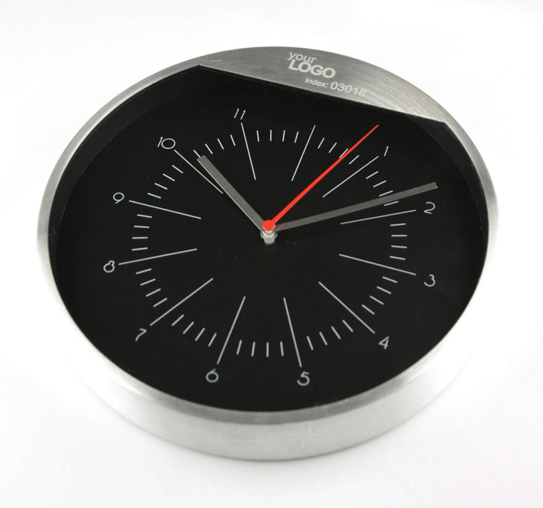 Kovové hodiny na stěnu s jednoduchým a elegantním designem. Logo může být vyryto na přední straně hodin. Vyžaduje 1 kus AA baterie, která není součástí článku.